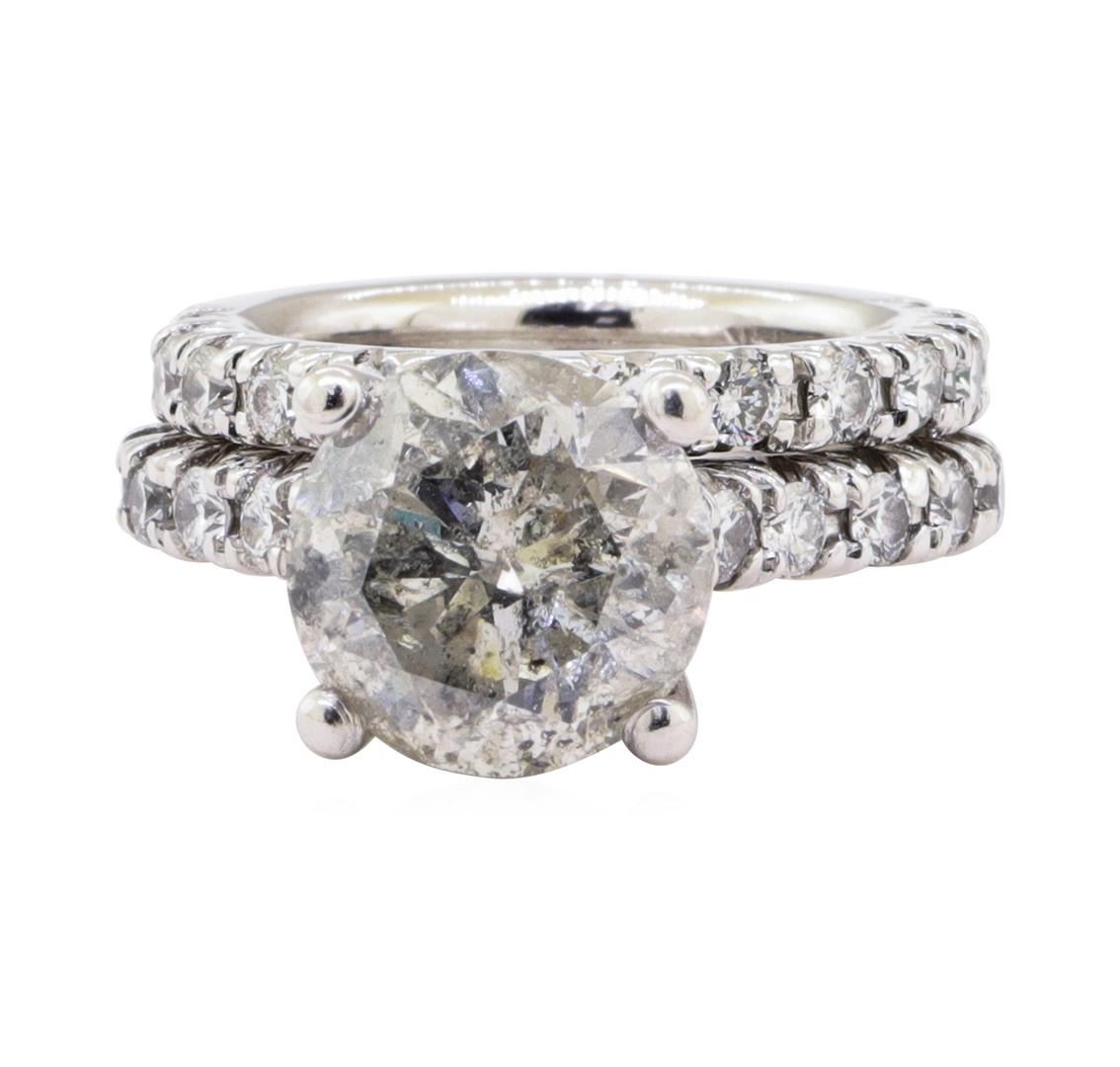 One set electronically tested 14KT white gold lady's cast wedding ring & wedding band with a doubole row straight line cathedral with a bright polish with milgrain detailing fininsh. Condition is new, good workmanship. The featured lady's ring set has a double shank measuring 5.40 millimeters wide. identified with markings of "14K". Containing: One prong set roundbrilliant cut diamond, measuring 10.00 - 9.94 x 6.30mm (depth est.) approximate weight of 3.85ct. Graded in the setting. Color I-J. Clarity I-2. Cut Good. Twenty-five prong set round brilliant cut diamonds. Measuring 2.20 - 2.10 x 1.33 (depth est.) approximate total weight of 25 stones = 0.95ct. Graded in the setting. Color H-I. Clarity SI-1 to SI-2. Cut good. Thirty-six prong set round brilliant cut diamonds, measuring 1.20-1.10x0.71 (depth est.) approximate total weight of 36 stones=0.20 ct. Graded in the setting Color H-I. Clarity SI-1 to SI-2. Cut Good. Total weight of diamonds 5.00 ct. Total weight of ring and wedding band 9.80gm. Total estimated retail value $23320.00 GAS Appraised.