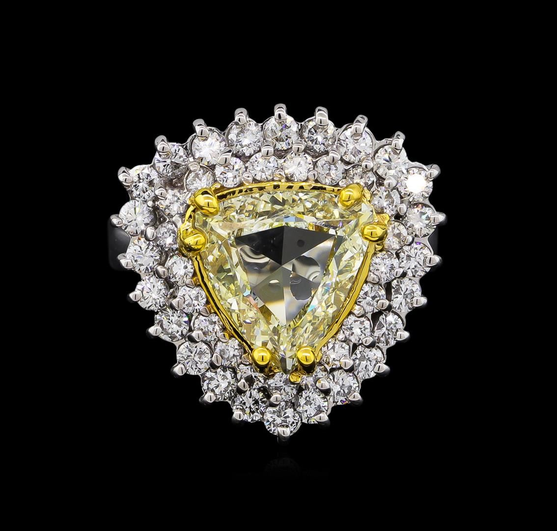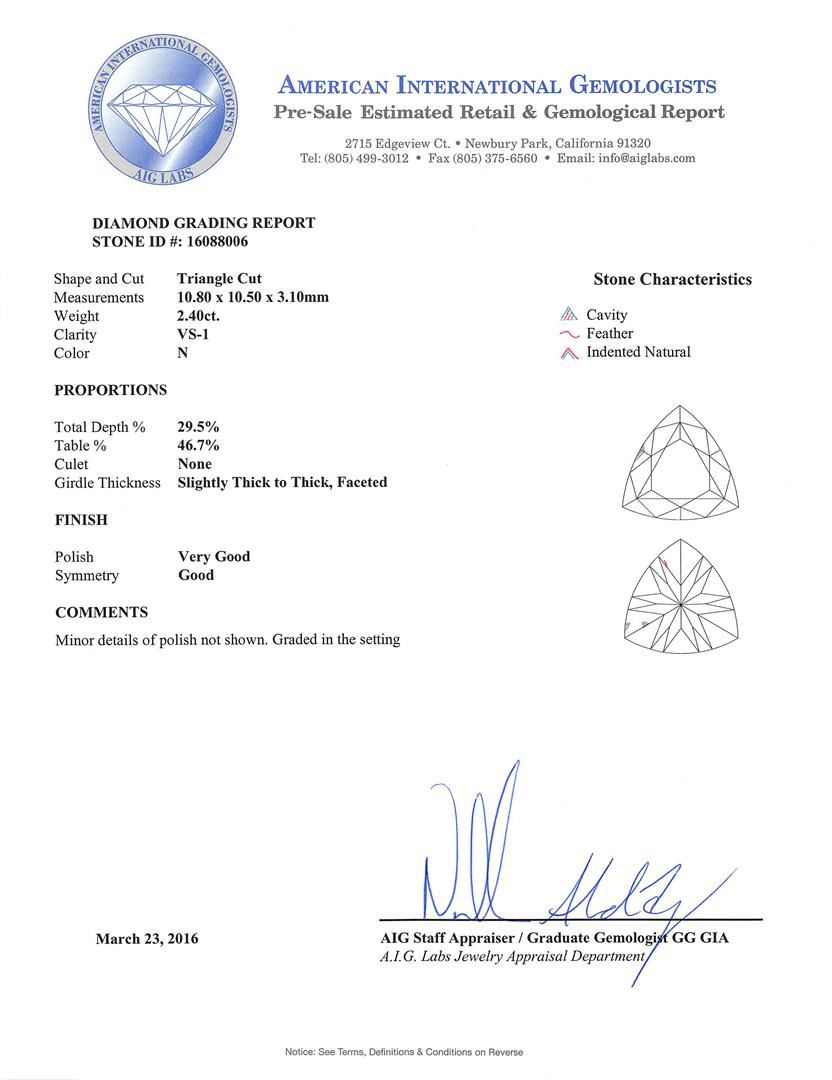 One electronically tested 14KT white gold ladies cast diamond ring. The featured diamond is set within tiered diamond bezels supported by a ribbed under gallery, completed by a two and one-half millimeter wide band. Bright polish finish with yellow gold overlay accents. Identified with markings of "K14". Condition is new, good workmanship. Containing: One prong set triangle cut diamond, measuring 10.80 x 10.50 x 3.10mm (depth est.) approximate weight of 2.40ct. Diamond Grading Report attached. Graded in the setting. Clarity: VS-1. Depth: 29.5%. Table 46.7%. Twenty-Four prong set round brilliant cut diamonds, measuring 2.10 - 2.00 x 1.23mm (depth est.) approximate total weight of 24 Stones = 0.80ct. Graded in the setting. Clarity: SI-1 to I-1. Color: G - I Twenty-One prong set round brilliant cut diamonds, measuring 1.70 - 1.70 x 1.02mm (depth est.) approximate total weight of 21 Stones = 0.45ct. Graded in the setting. Clarity: SI-2 to I-1. Color: G - I. Total Weight of Diamonds 3.65ct. Total Weight of Ring 8.51gm. AIG Appraised at $31,975.00.