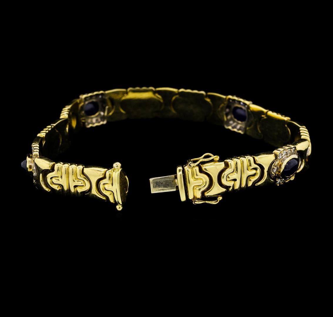 One electronically tested 14KT yellow gold lady's combination cast & assembled fashion bracelet with a tongue clasp with foldover safety with a bright polish finish. The featured lady's bracelet measures approximately seven and a quarter inches in length. Identified with markings of 'K14'. Condition is like new, good workmanship. Containing: Four bezel set oval cabochon modified cut natural blue sapphires, measuring 6.50 x 4.80 x 2.70mm, (depth est.) approximate total weight of 3.65ct., clarity is heavily included, medium dark, moderately strong, blue color, (GIA B 6/4), cut is good. Transmitting light somewhat diffusely, semi-transparent to translucent. Naturally occurring internal & external characteristics are present. Colored gemstones are presumed to have been subjected to commonly used enhancement processes. Graded in the setting. Forty prong set round brilliant cut diamonds, measuring 1.50 - 1.40 x 0.90mm (depth est.) approximate total weight of 40 Stones = 0.40ct. Graded in the setting. Color H - I Clarity SI-1 to I-1 Cut Good. Total Weight of Colored Stones 3.65ct.. Total Weight of Diamonds 0.40ct.. Total Weight of Bracelet 19.30gm GAS Appraised at $5735.00. GAS Appraised at $5,735.00.