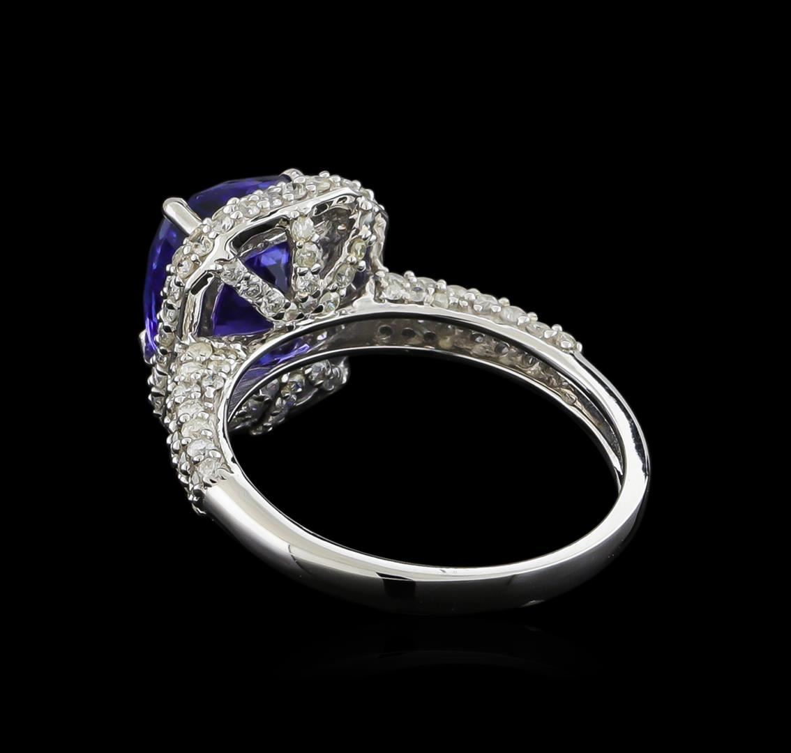 One electronically tested 14KT white gold ladies cast tanzanite and diamond ring with a bright polish finish. The featured tanzanite is set within tiered diamond bezels supported by a diamond set under gallery and diamond set shoulders, completed by a two millimeter wide band. Trademark is 14K. Identified with markings of "Orianne". Condition is new, good workmanship. Containing: One prong set rectangular cushion mixed cut natural tanzanite, measuring 8.85 x 7.83 x 6.14mm, 6%. bulge factor, approximate weight of 3.65ct., clarity is eye clean, type I, medium dark, very slightly grayish, bluish violet color, (GIA bV 6/3), cut is good. Transmitting light with no distortion, transparent. Graded in the setting. Tanzanite is a very rare gemstone that is only found in the country of Tanzania. Originally discovered in 1967. Tiffany & Company, named the stone Tanzanite. It is found in the Usumburu Mountains that border the Umba Valley of northern Tanzania. Tanzanite occurs in gray, brown, violet, blue, reddish-purple, & green. The gem is interesting because of its exceptional pleochroism. Rotated in different directions a tanzanite will exhibit multiple changes of color. Tanzanite has a low tolerance to ultrasonic cleaning, and should not be cleaned using this method. One Hundred Thirty-Eight prong set round brilliant cut diamonds, measuring 1.30 - 1.20 x 0.75mm (depth est.) approximate total weight of 138 Stones = 1.08ct. Graded in the setting. Clarity: I-1 to I-2. Color: H - J. Total Weight of Colored Stones 3.65ct. Total Weight of Diamonds 1.08ct. Total Weight of Ring 3.97gm. AIG Appraised at $11,545.00.