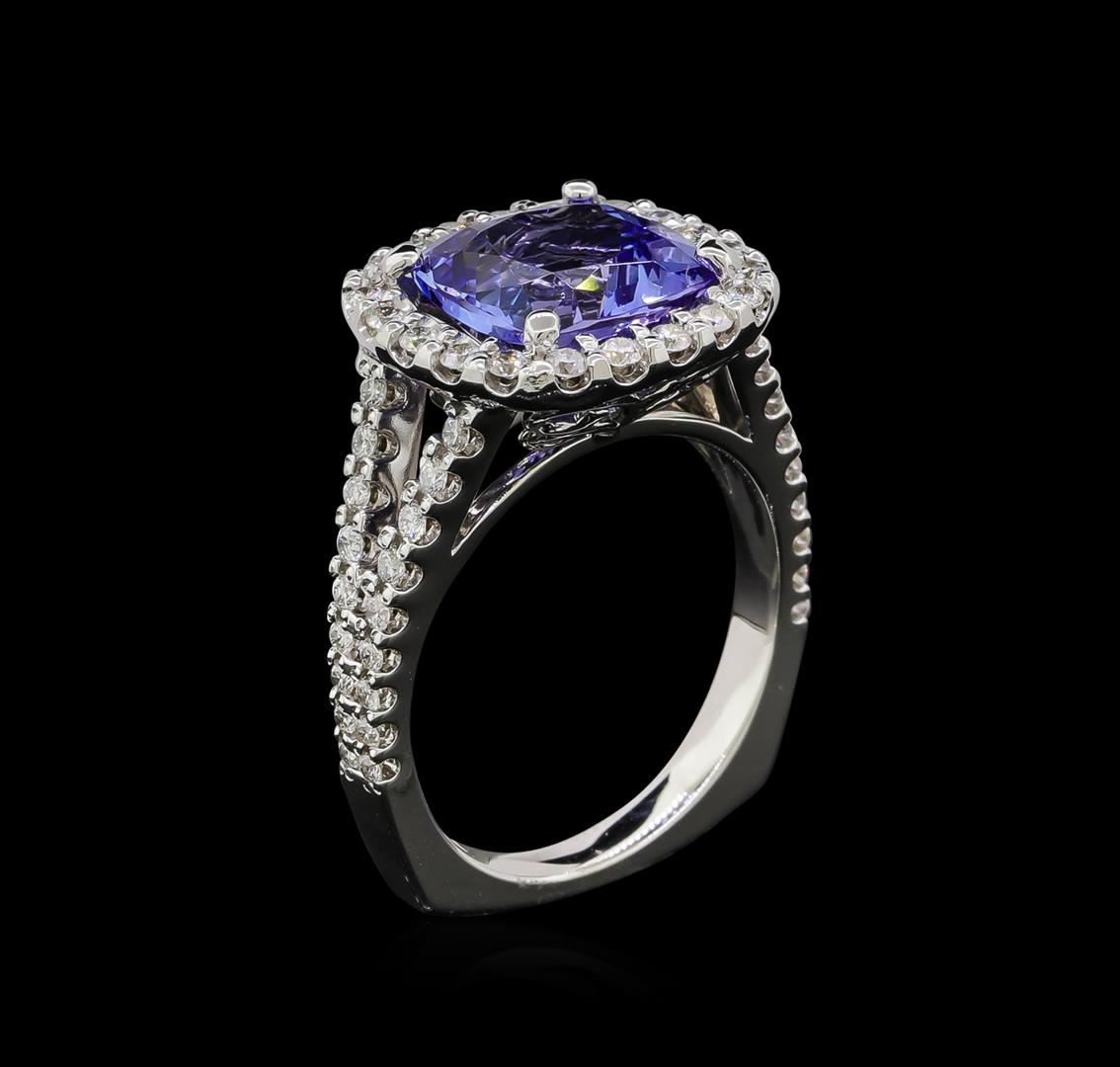 One electronically tested 14KT white gold lady's cast fashion ring with a split European shank with a halo with a bright polish finish. The featured lady's ring has a shank measuring 2.49 millimeters wide. Identified with markings of '14K'. Condition is new, good workmanship. Containing: One prong set square cushion modified brilliant cut natural tanzanite, measuring 9.31 x 9.20 x 5.71mm, (depth est.) approximate weight of 3.65ct., clarity is eye clean, medium, moderately strong, bluish violet color, (GIA bV 5/4), cut is good. Transmitting light with no distortion, transparent. Colored gemstones are presumed to have been subjected to commonly used enhancement processes. Graded in the setting. Twenty prong set round brilliant cut diamonds, measuring 1.60 - 1.50 x 0.96mm (depth est.) approximate total weight of 20 Stones = 0.29ct. Graded in the setting. Clarity SI-1 to SI-2. Color: H - I Cut Good Twenty prong set round brilliant cut diamonds, measuring 1.50 - 1.40 x 0.87mm (depth est.) approximate total weight of 20 Stones = 0.22ct. Graded in the setting. Clarity SI-1 to I-1. Color: H - I Cut Good Sixteen prong set round brilliant cut diamonds, measuring 1.30 - 1.20 x 0.78mm (depth est.) approximate total weight of 16 Stones = 0.12ct. Graded in the setting. Clarity SI-1 to I-1. Color: H - I Cut Good. Total Weight of Colored Stones 3.65ct.. Total Weight of Diamonds 0.63ct.. Total Weight of Ring 6.20gm GAS Appraised at $8,260.00.