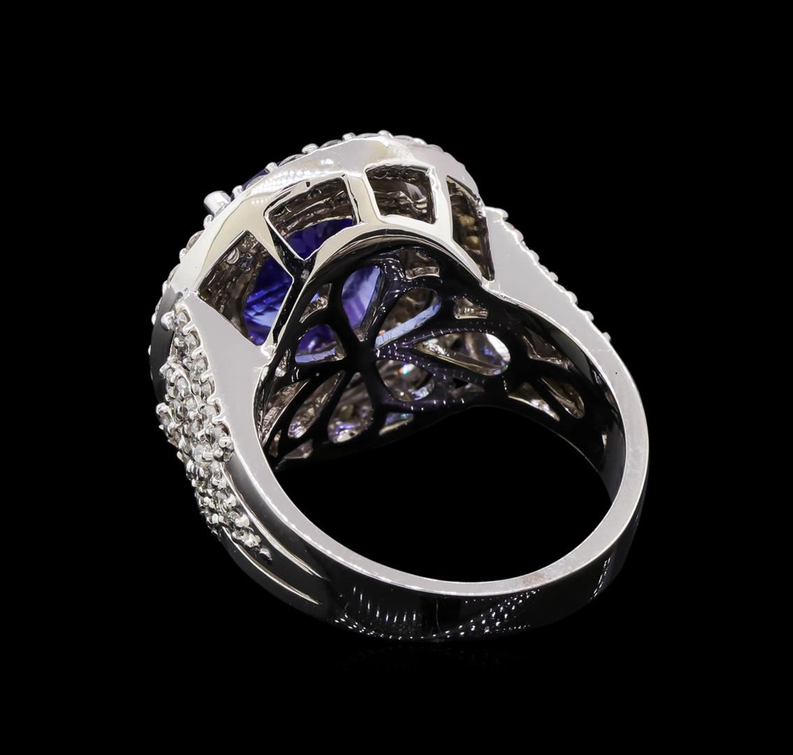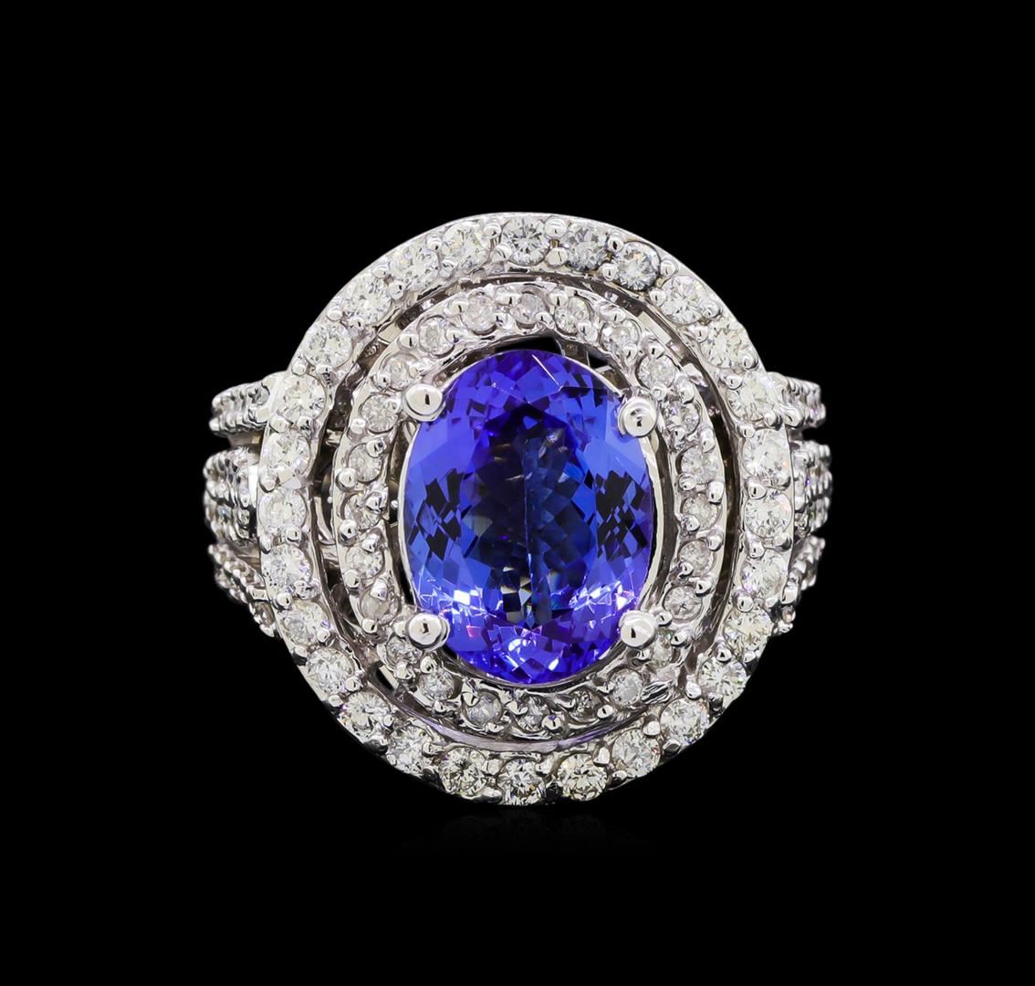 One electronically tested 14KT white gold lady's cast fashion ring with a split shank double basket halo with a bright polish finish. The featured lady's ring has a shank measuring 3.55 millimeters in width. Identified with markings of "K14". Condition is new, good workmanship. Containing: One prong set oval modified brilliant cut natural tanzanite, measuring 11.20 x 8.28 x 5.13mm, (depth est.) 5%. bulge factor, approximate weight of 3.65ct., clarity is eye clean, medium, moderately strong, violetish blue color, (GIA vB 5/4), cut is very good. Transmitting light with no distortion, transparent. Colored gemstones are presumed to have been subjected to commonly used enhancement processes. Graded in the setting. Twenty-Eight prong set round brilliant cut diamonds, measuring 1.70 - 1.65 x 1.04mm (depth est.) approximate total weight of 28 Stones = 0.53ct. Graded in the setting. Clarity: SI-1 to SI-2. Color: G - Good Twenty-Four prong set round brilliant cut diamonds, measuring 1.40 - 1.30 x 0.84mm (depth est.) approximate total weight of 24 Stones = 0.24ct. Graded in the setting. Clarity: SI-1 to I-1. Color: G - Good Fifty prong set round brilliant cut diamonds, measuring 1.30 - 1.25 x 0.79mm (depth est.) approximate total weight of 50 Stones = 0.42ct. Graded in the setting. Clarity: SI-1 to I-1. Color: G - I. Cut Good. Total Weight of Colored Stones 3.65ct. Total Weight of Diamonds 1.19ct. Total Weight of Ring 11.40gm. GAS Appraised at $10,880.00.