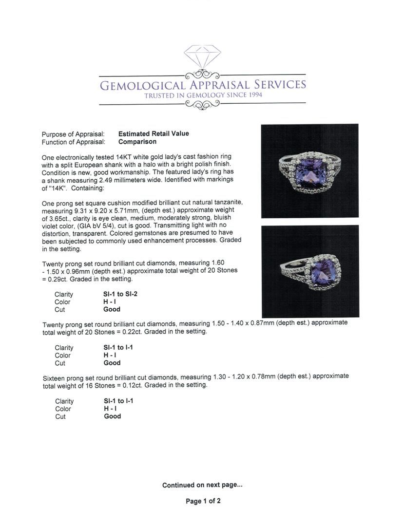One electronically tested 14KT white gold lady's cast fashion ring with a split European shank with a halo with a bright polish finish. The featured lady's ring has a shank measuring 2.49 millimeters wide. Identified with markings of '14K'. Condition is new, good workmanship. Containing: One prong set square cushion modified brilliant cut natural tanzanite, measuring 9.31 x 9.20 x 5.71mm, (depth est.) approximate weight of 3.65ct., clarity is eye clean, medium, moderately strong, bluish violet color, (GIA bV 5/4), cut is good. Transmitting light with no distortion, transparent. Colored gemstones are presumed to have been subjected to commonly used enhancement processes. Graded in the setting. Twenty prong set round brilliant cut diamonds, measuring 1.60 - 1.50 x 0.96mm (depth est.) approximate total weight of 20 Stones = 0.29ct. Graded in the setting. Clarity SI-1 to SI-2. Color: H - I Cut Good Twenty prong set round brilliant cut diamonds, measuring 1.50 - 1.40 x 0.87mm (depth est.) approximate total weight of 20 Stones = 0.22ct. Graded in the setting. Clarity SI-1 to I-1. Color: H - I Cut Good Sixteen prong set round brilliant cut diamonds, measuring 1.30 - 1.20 x 0.78mm (depth est.) approximate total weight of 16 Stones = 0.12ct. Graded in the setting. Clarity SI-1 to I-1. Color: H - I Cut Good. Total Weight of Colored Stones 3.65ct.. Total Weight of Diamonds 0.63ct.. Total Weight of Ring 6.20gm GAS Appraised at $8,260.00.