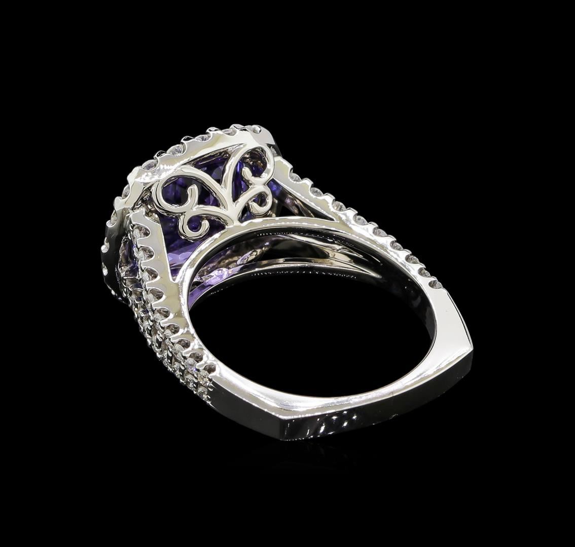 One electronically tested 14KT white gold lady's cast fashion ring with a split European shank with a halo with a bright polish finish. The featured lady's ring has a shank measuring 2.49 millimeters wide. Identified with markings of '14K'. Condition is new, good workmanship. Containing: One prong set square cushion modified brilliant cut natural tanzanite, measuring 9.31 x 9.20 x 5.71mm, (depth est.) approximate weight of 3.65ct., clarity is eye clean, medium, moderately strong, bluish violet color, (GIA bV 5/4), cut is good. Transmitting light with no distortion, transparent. Colored gemstones are presumed to have been subjected to commonly used enhancement processes. Graded in the setting. Twenty prong set round brilliant cut diamonds, measuring 1.60 - 1.50 x 0.96mm (depth est.) approximate total weight of 20 Stones = 0.29ct. Graded in the setting. Clarity SI-1 to SI-2. Color: H - I Cut Good Twenty prong set round brilliant cut diamonds, measuring 1.50 - 1.40 x 0.87mm (depth est.) approximate total weight of 20 Stones = 0.22ct. Graded in the setting. Clarity SI-1 to I-1. Color: H - I Cut Good Sixteen prong set round brilliant cut diamonds, measuring 1.30 - 1.20 x 0.78mm (depth est.) approximate total weight of 16 Stones = 0.12ct. Graded in the setting. Clarity SI-1 to I-1. Color: H - I Cut Good. Total Weight of Colored Stones 3.65ct.. Total Weight of Diamonds 0.63ct.. Total Weight of Ring 6.20gm GAS Appraised at $8,260.00.