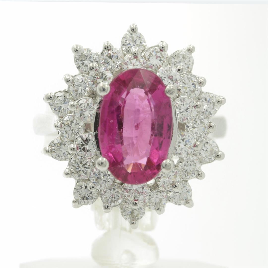 One Round Cut Rubellite Diamonds Oval Cut Flower Ring in 14K White Gold. Total stone weight is 2.15 carats. Size 6.75 can be resized. Setting style is engagement with accent. Gross weight totals 6.15 grams with a total of 31 stones. Condition is brand new. Main stone is non enhanced / natural straight from mother earth. Main stone weight is 2.15 carats with oval shape, fine deep color, and excellent cut. Side stones are natural and non-enhanced with a total stone weight of 1.51 carats. Side diamond shape is brilliant round cut with VS 1 clarity, G-H color, fine cut, with a total of 30 diamonds. Included with independent certification with a retail value of $9,900.