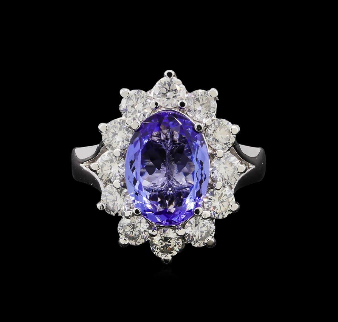 One electronically tested 14KT white gold lady's cast fashion ring with a split shank basket halo with a bright polish finish. The featured lady's ring has a shank measuring 2.95 millimeters in width. Identified with markings of '14K'. Condition is new, good workmanship. Containing: One prong set oval modified brilliant cut natural tanzanite, measuring 11.50 x 8.60 x 5.30mm, (depth est.) approximate weight of 3.66ct., clarity is eye clean, light, very slightly grayish, violetish blue color, (GIA vB 3/3), cut is good. Transmitting light with no distortion, transparent. Colored gemstones are presumed to have been subjected to commonly used enhancement processes. Graded in the setting. Twelve prong set round brilliant cut diamonds, measuring 3.25 - 3.15 x 1.98mm (depth est.) approximate total weight of 12 Stones = 1.53ct. Graded in the setting. Clarity VS-2 to SI-1. Color: I - J Cut Good. Total Weight of Colored Stones 3.66ct.. Total Weight of Diamonds 1.53ct.. Total Weight of Ring 7.70gm. GAS Appraised at $7,725.00.