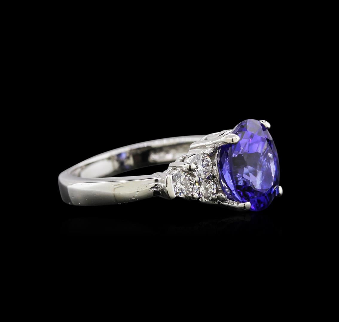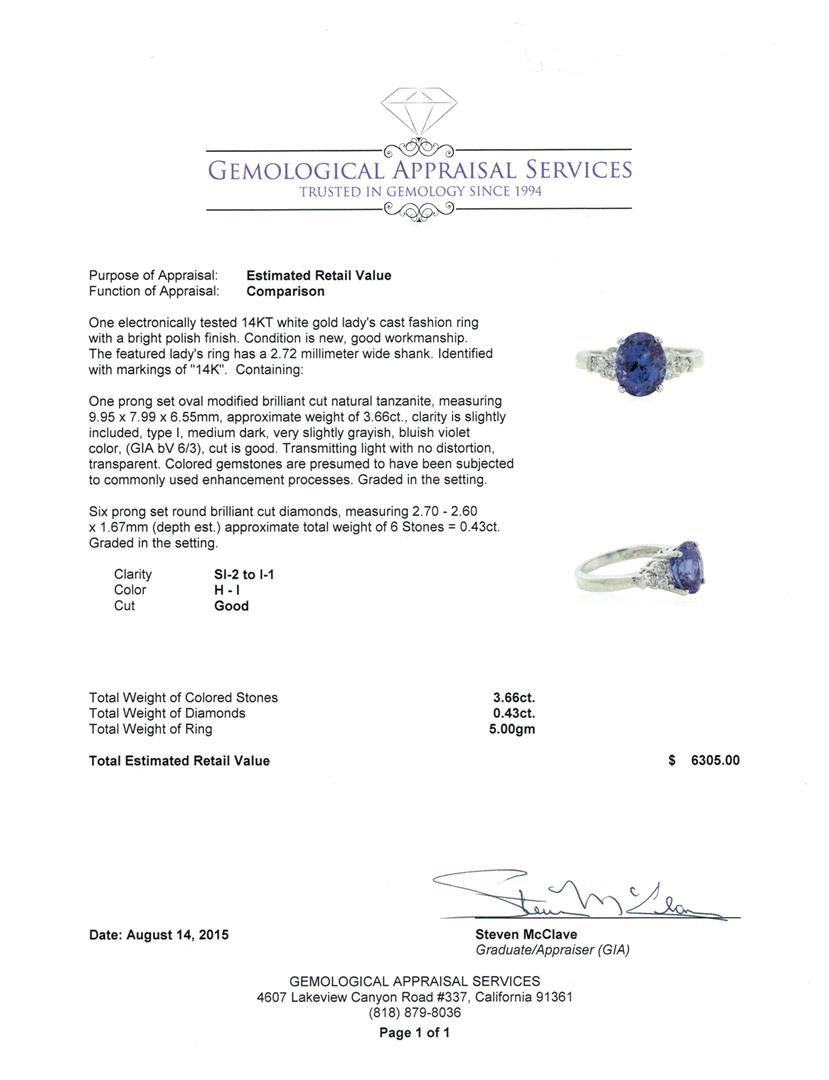 One electronically tested 14KT white gold lady's cast fashion ring with a bright polish finish. The featured lady's ring has a 2.72 millimeter wide shank. Identified with markings of "14K". Condition is new, good workmanship. Containing: One prong set oval modified brilliant cut natural tanzanite, measuring 9.95 x 7.99 x 6.55mm, approximate weight of 3.66ct., clarity is slightly included, type I, medium dark, very slightly grayish, bluish violet color, (GIA bV 6/3), cut is good. Transmitting light with no distortion, transparent. Colored gemstones are presumed to have been subjected to commonly used enhancement processes. Graded in the setting. Six prong set round brilliant cut diamonds, measuring 2.70 - 2.60 x 1.67mm (depth est.) approximate total weight of 6 Stones = 0.43ct. Graded in the setting. Clarity: SI-2 to I-1. Color: H - I. Cut Good. Total Weight of Colored Stones 3.66ct. Total Weight of Diamonds 0.43ct. Total Weight of Ring 5.00gm. GAS Appraised at $6,305.00.