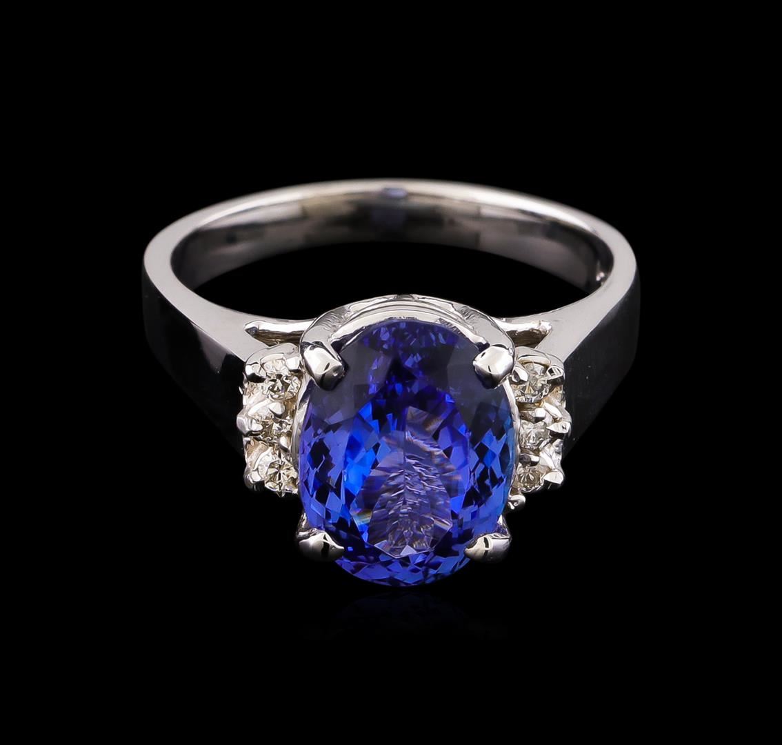 One electronically tested 14KT white gold lady's cast fashion ring with a cathedral shank with a bright polish finish. The featured lady's ring has a shank measuring 2.62 millimeters wide. Identified with markings of "14K". Condition is new, good workmanship. Containing: One prong set oval modified brilliant cut natural tanzanite, measuring 10.97 x 8.31 x 5.29mm, 8%. bulge factor, approximate weight of 3.66ct., clarity is eye clean, medium, moderately strong, bluish violet color, (GIA bV 5/4), cut is very good. Transmitting light with no distortion, transparent. Colored gemstones are presumed to have been subjected to commonly used enhancement processes. Graded in the setting. Six prong set round brilliant cut diamonds, measuring 1.80 - 1.70 x 1.09mm (depth est.) approximate total weight of 6 Stones = 0.12ct. Graded in the setting. Clarity: SI-1 to SI-2. Color: H - I. Cut Good. Total Weight of Colored Stones 3.66ct. Total Weight of Diamonds 0.12ct. Total Weight of Ring 5.70gm.