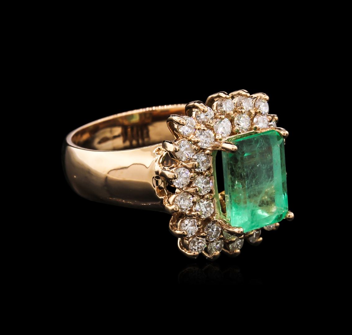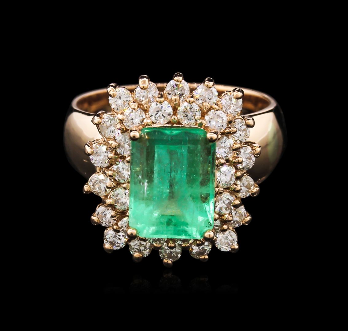 One electronically tested 14KT rose gold lady's cast fashion ring with a basket double halo with a bright polish finish. The featured lady's ring has a shank measuring 4.38 millimeters in width. Condition is new, good workmanship. Containing: One prong set emerald step cut natural emerald, measuring 10.35 x 7.68 x 6.32mm, approximate weight of 3.66ct., clarity is moderately included, type III, medium light, very slightly grayish, very slightly bluish green color, (GIA vslbG 4/3), cut is good. Colored gemstones are presumed to have been subjected to commonly used enhancement processes. Indications of oil residue. Graded in the setting. Thirty-Two prong set round brilliant cut diamonds, measuring 2.20 - 2.10 x 1.38mm (depth est.) approximate total weight of 32 Stones = 1.25ct. Graded in the setting. Clarity: SI-1 to I-1. Color: H - I. Cut Good. Total Weight of Colored Stones 3.66ct. Total Weight of Diamonds 1.25ct. Total Weight of Ring 9.30gm. GAS Appraised at $9,720.00.