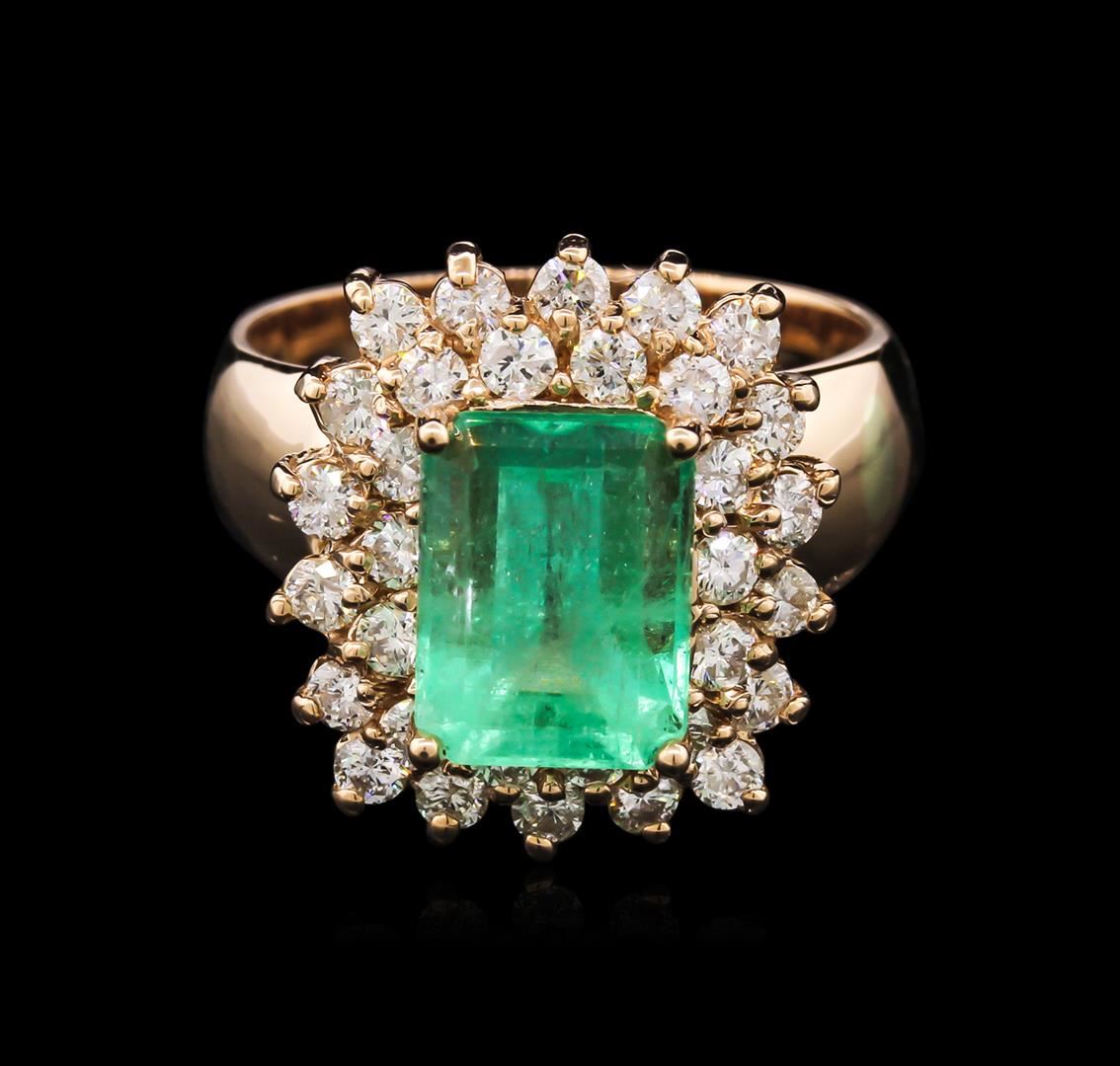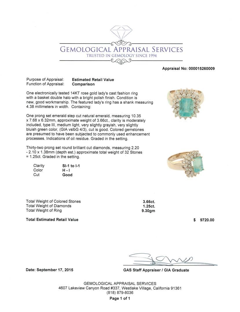 One electronically tested 14KT rose gold lady's cast fashion ring with a basket double halo with a bright polish finish. The featured lady's ring has a shank measuring 4.38 millimeters in width. Condition is new, good workmanship. Containing: One prong set emerald step cut natural emerald, measuring 10.35 x 7.68 x 6.32mm, approximate weight of 3.66ct., clarity is moderately included, type III, medium light, very slightly grayish, very slightly bluish green color, (GIA vslbG 4/3), cut is good. Colored gemstones are presumed to have been subjected to commonly used enhancement processes. Indications of oil residue. Graded in the setting. Thirty-Two prong set round brilliant cut diamonds, measuring 2.20 - 2.10 x 1.38mm (depth est.) approximate total weight of 32 Stones = 1.25ct. Graded in the setting. Clarity: SI-1 to I-1. Color: H - I. Cut Good. Total Weight of Colored Stones 3.66ct. Total Weight of Diamonds 1.25ct. Total Weight of Ring 9.30gm. GAS Appraised at $9,720.00.