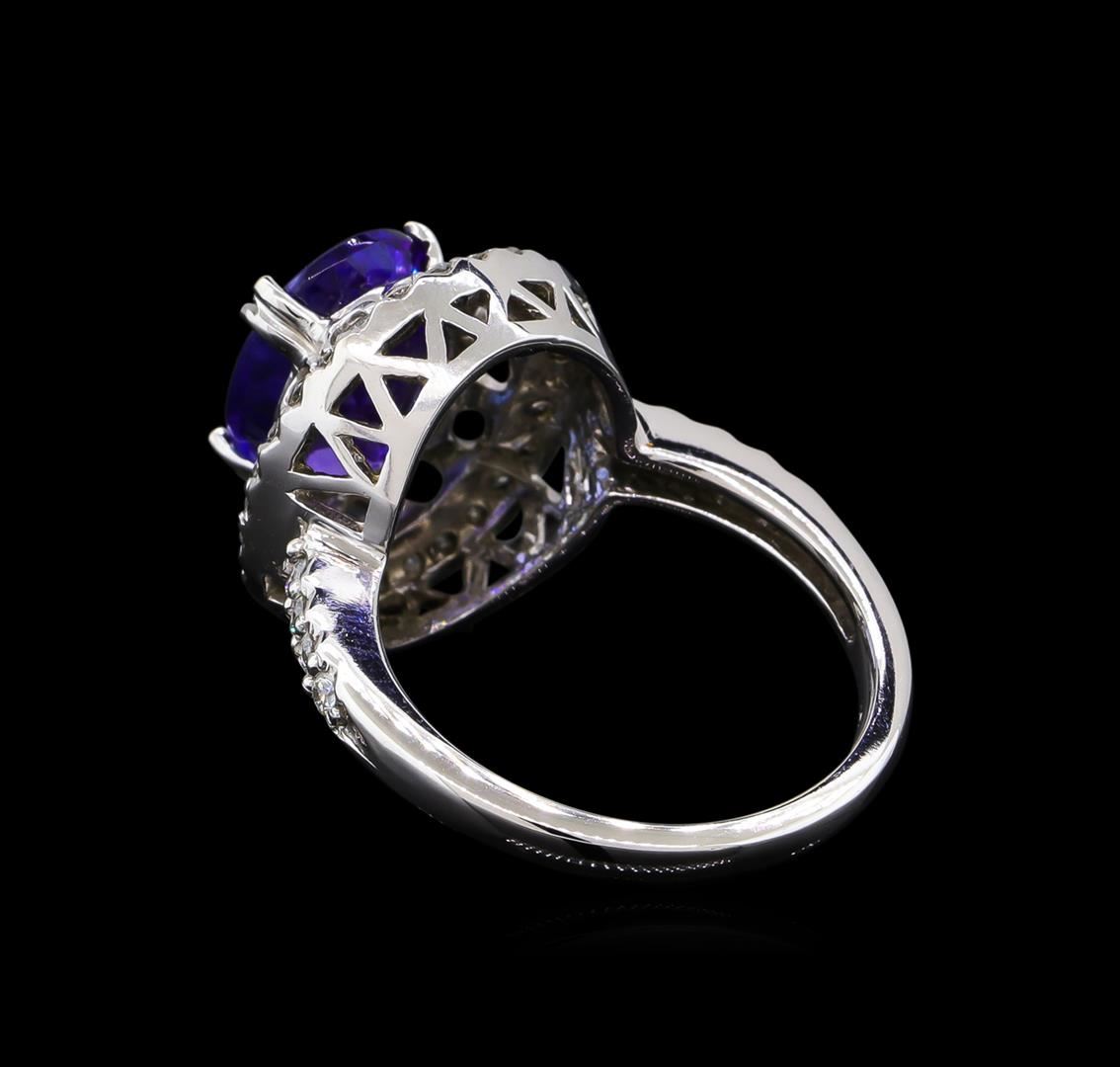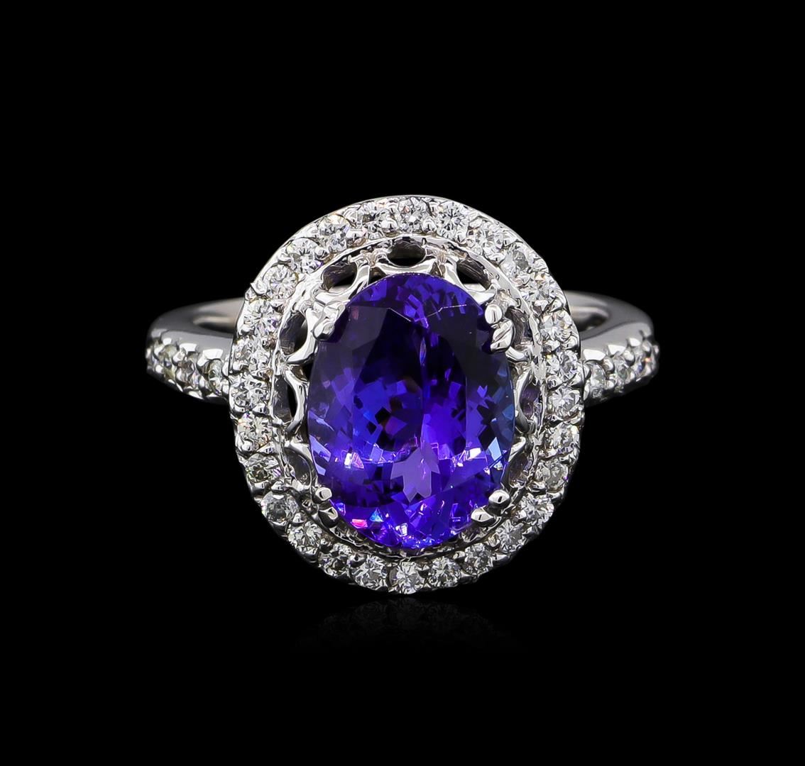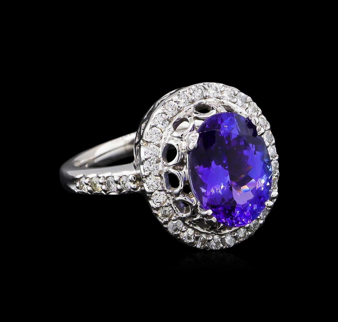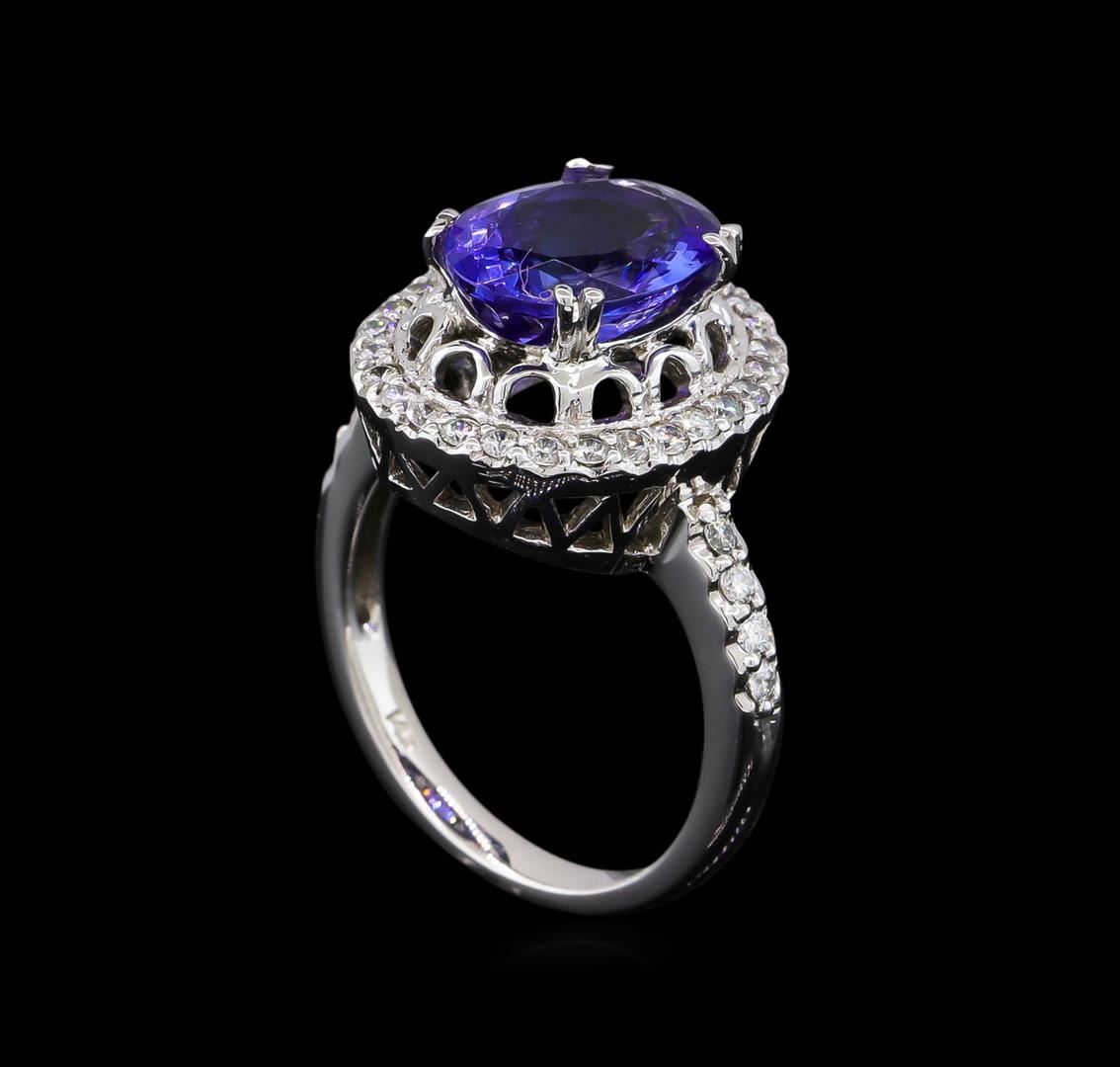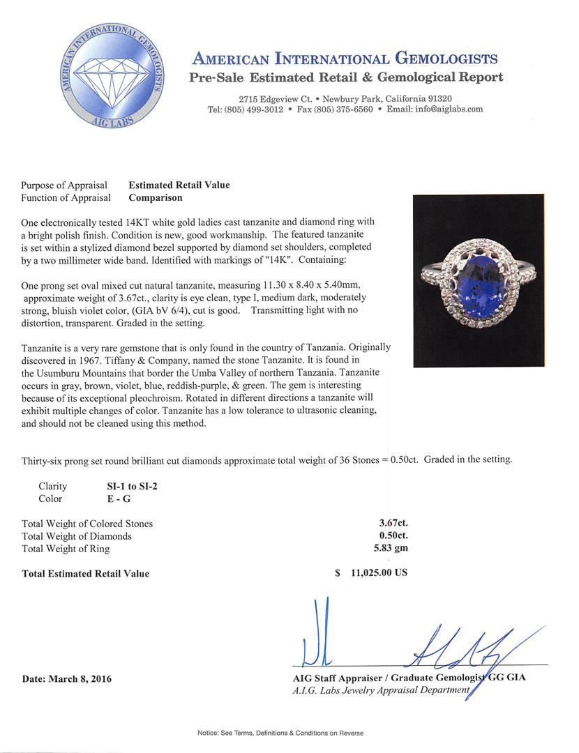 One electronically tested 14KT white gold ladies cast tanzanite and diamond ring with a bright polish finish. The featured tanzanite is set within a stylized diamond bezel supported by diamond set shoulders, completed by a two millimeter wide band. Identified with markings of "14K". Condition is new, good workmanship. Containing: One prong set oval mixed cut natural tanzanite, measuring 11.30 x 8.40 x 5.40mm, approximate weight of 3.67ct., clarity is eye clean, type I, medium dark, moderately strong, bluish violet color, (GIA bV 6/4), cut is good. Transmitting light with no distortion, transparent. Graded in the setting. Tanzanite is a very rare gemstone that is only found in the country of Tanzania. Originally discovered in 1967. Tiffany & Company, named the stone Tanzanite. It is found in the Usumburu Mountains that border the Umba Valley of northern Tanzania. Tanzanite occurs in gray, brown, violet, blue, reddish-purple, & green. The gem is interesting because of its exceptional pleochroism. Rotated in different directions a tanzanite will exhibit multiple changes of color. Tanzanite has a low tolerance to ultrasonic cleaning, and should not be cleaned using this method. Thirty-Six prong set round brilliant cut diamonds approximate total weight of 36 Stones = 0.50ct. Graded in the setting. Clarity: SI-1 to SI-2. Color: E - G. Total Weight of Colored Stones 3.67ct. Total Weight of Diamonds 0.50ct. Total Weight of Ring 5.83gm. AIG Appraised at $11,025.00.