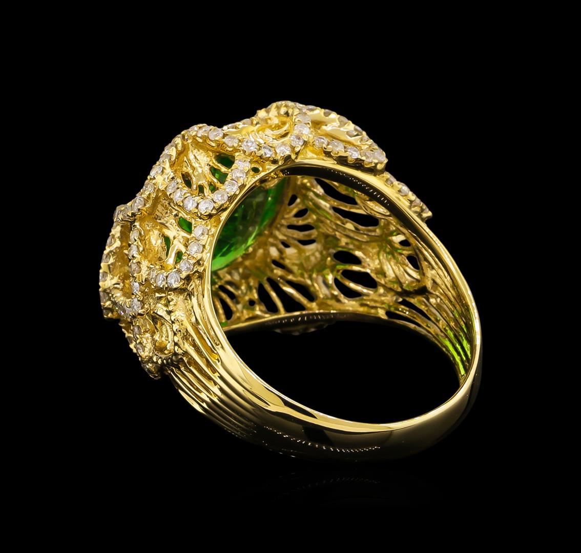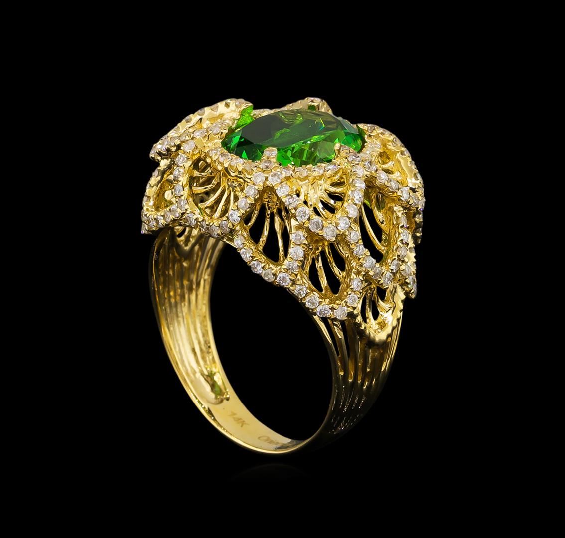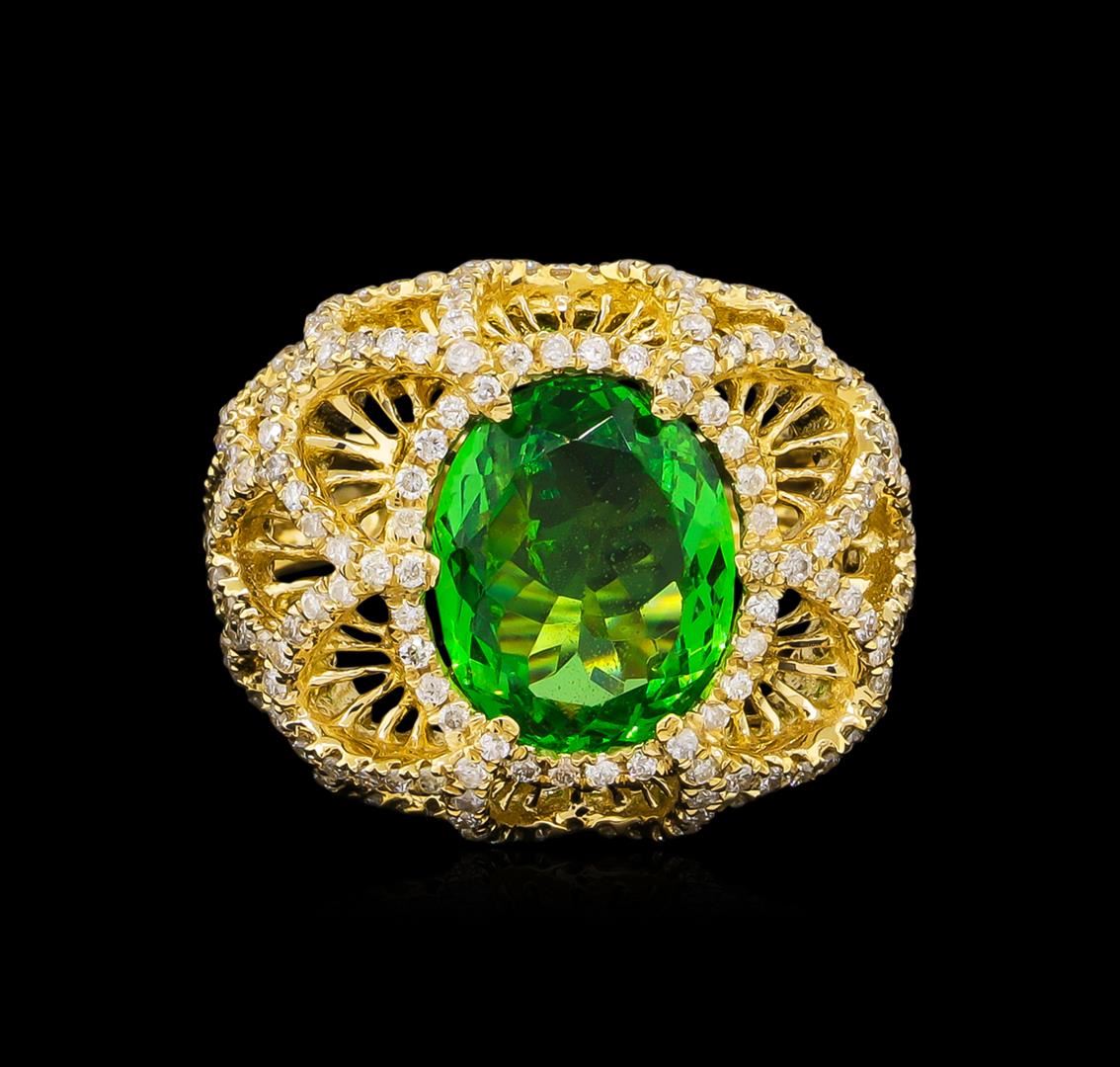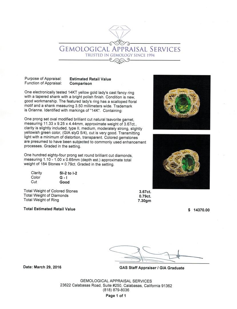 One electronically tested 14KT yellow gold lady's cast fancy ring with a tapered shank with a bright polish finish. The featured lady's ring has a scalloped floral motif and a shank measuring 3.50 millimeters wide. Trademark is Orianne. Identified with markings of "14K". Condition is new, good workmanship. Containing: One prong set oval modified brilliant cut natural tsavorite garnet, measuring 11.33 x 9.25 x 4.44mm, approximate weight of 3.67ct., clarity is slightly included, type II, medium, moderately strong, slightly yellowish green color, (GIA slyG 5/4), cut is very good. Transmitting light with a minimum of distortion, transparent. Colored gemstones are presumed to have been subjected to commonly used enhancement processes. Graded in the setting. One Hundred Eighty-Four prong set round brilliant cut diamonds, measuring 1.10 - 1.00 x 0.65mm (depth est.) approximate total weight of 184 Stones = 0.79ct. Graded in the setting. Clarity: SI-2 to I-2. Color: G - I. Cut Good. Total Weight of Colored Stones 3.67ct. Total Weight of Diamonds 0.79ct. Total Weight of Ring 7.30gm. GAS Appraised at $14,370.00.