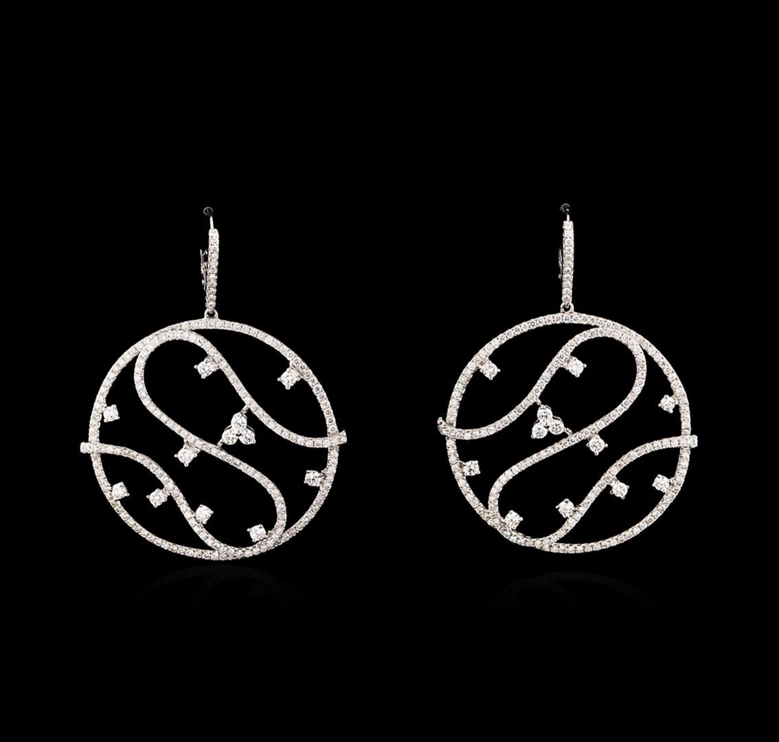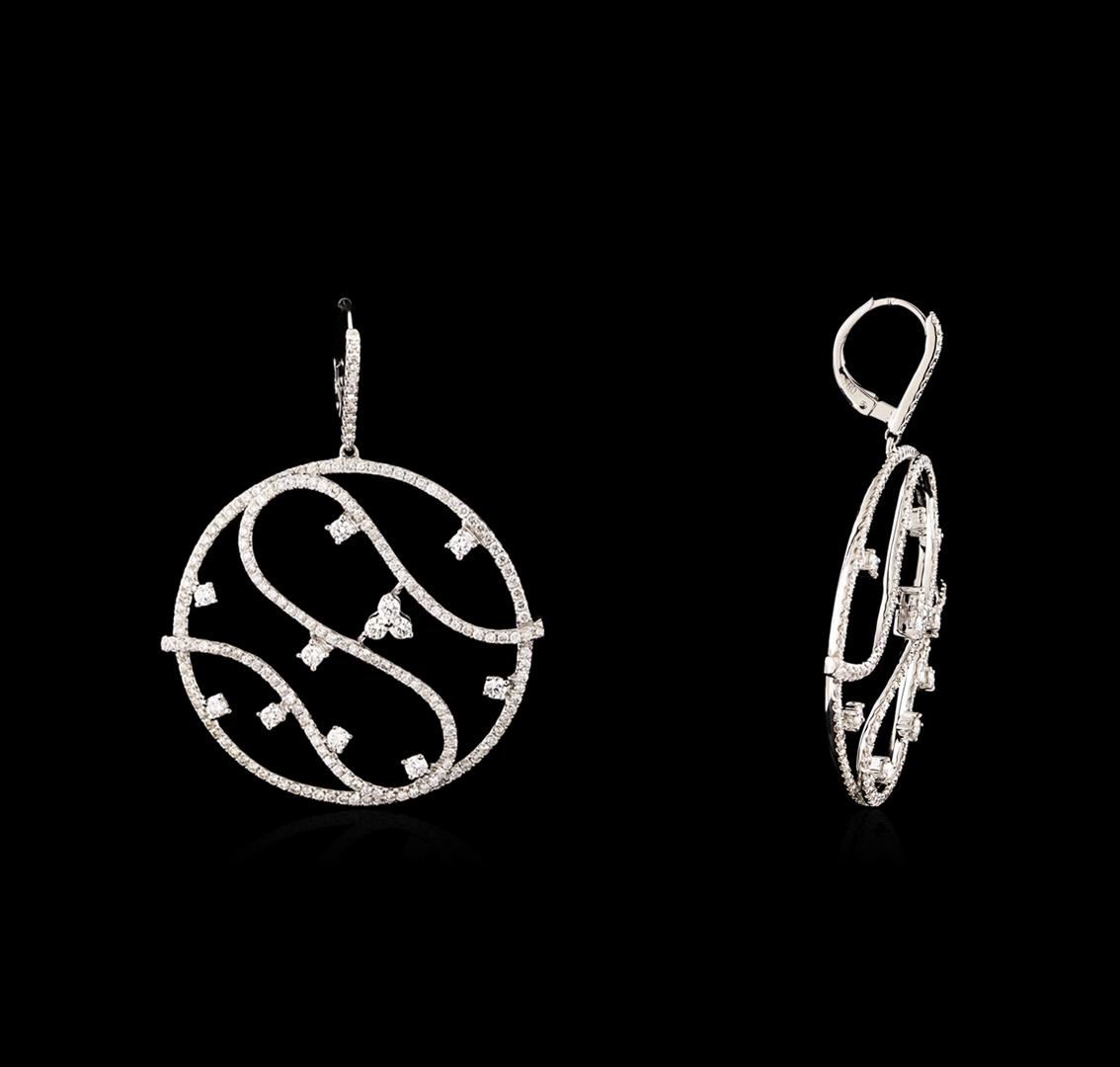 One pair electronically tested 18KT white gold lady's combination cast & assembled fashion earrings with hinged clip backs with a bright polish finish. Identified with markings of "750". Condition is new, good workmanship. Containing: Twenty-Four prong set round brilliant cut diamonds, measuring 2.40 - 2.30 x 1.46mm (depth est.) approximate total weight of 24 Stones = 1.18ct. Graded in the setting. Clarity: VS-1 to VS-2 . Color: F - Ideal Three Hundred Eighty prong set round brilliant cut diamonds, measuring 1.25 - 1.15 x 0.74mm (depth est.) approximate total weight of 380 Stones = 2.49ct. Graded in the setting. Clarity: VS-1 to SI-1 . Color: G - Very Good. Total Weight of Diamonds 3.67ct.. Total Weight of Earrings 11.40gm. GAS Appraised at $14,685.00.