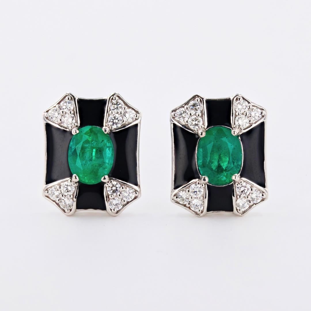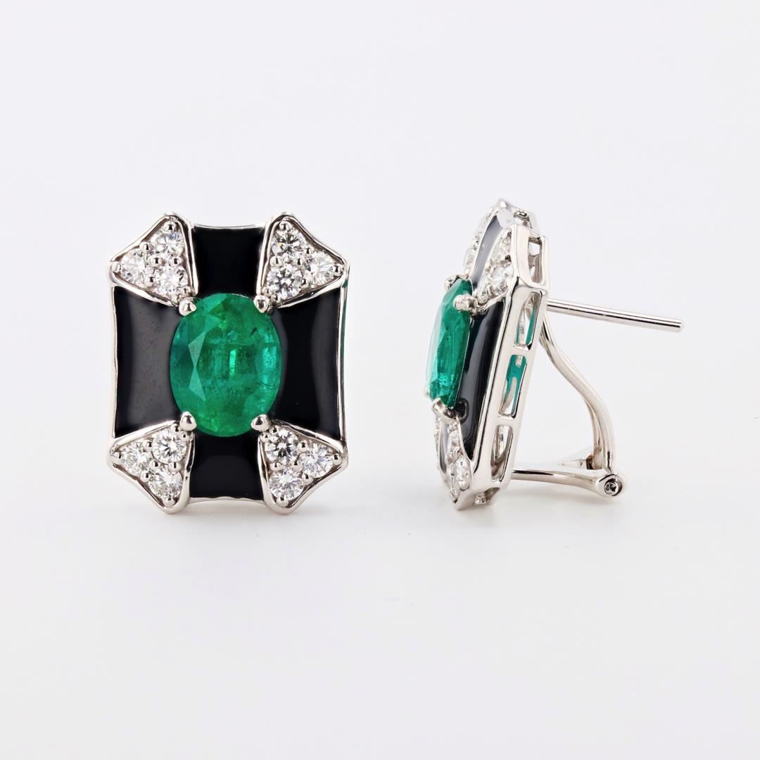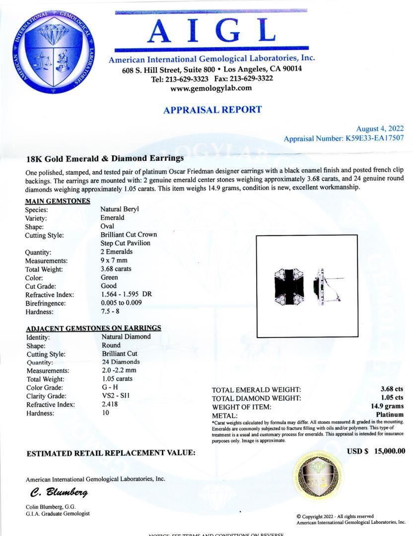 One polished, stamped, and tested pair of platinum Oscar Friedman designer earrings with a black enamel finish and posted french clip backings. The earrings are mounted with: 2 genuine emerald center stones weighing approximately 3.68 carats, and 24 genuine round diamonds weighing approximately 1.05 carats. This item weighs 14.9 grams, condition is new, excellent workmanship. MAIN GEMSTONES Species: Natural Beryl Variety: Emerald Shape: Oval Cutting Style: Brilliant Cut Crown Step Cut Pavilion Quantity: 2 Emeralds Measurements: 9 x 7mm Total Weight: 3.68 carats Color: Green Cut Grade: Good Refractive Index: 1.564 - 1.595 DR Birefringence: 0.005 to 0.009 Hardness: 7.5 - 8 ADJACENT GEMSTONES ON EARRINGS Identity: Natural Diamond Shape: Round Cutting Style: Brilliant Cut Quantity: 24 Diamonds Measurements: 2.0 -2.2mm Total Weight: 1.05 carats Color Grade: G - H Clarity Grade: VS2 to SI1 Refractive Index: 2.418 Hardness: 10 TOTAL EMERALD WEIGHT: 3.68ctw TOTAL DIAMOND WEIGHT: 1.05ctw WEIGHT OF ITEM: 14.9 grams METAL: Platinum #LREF-5933