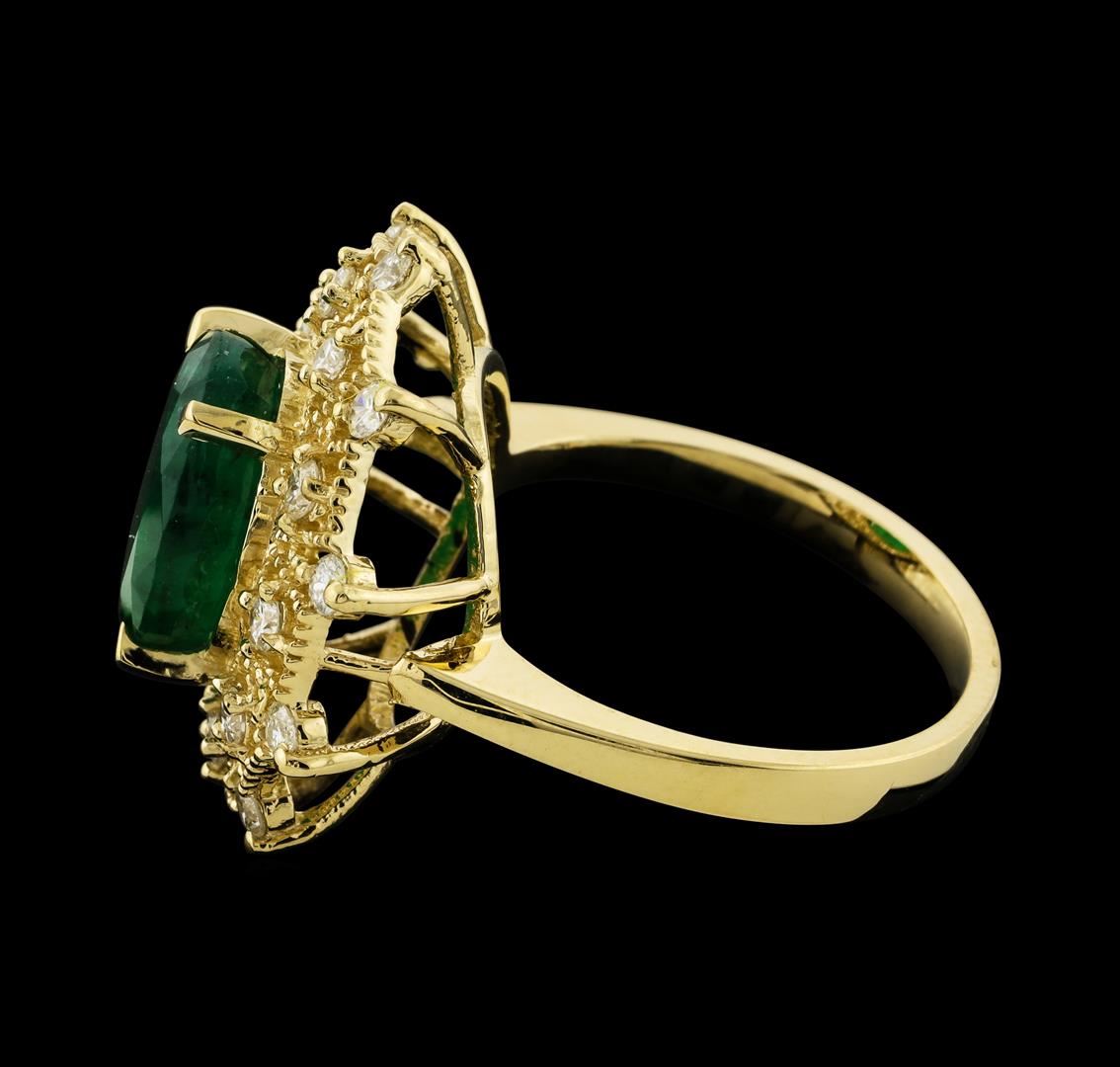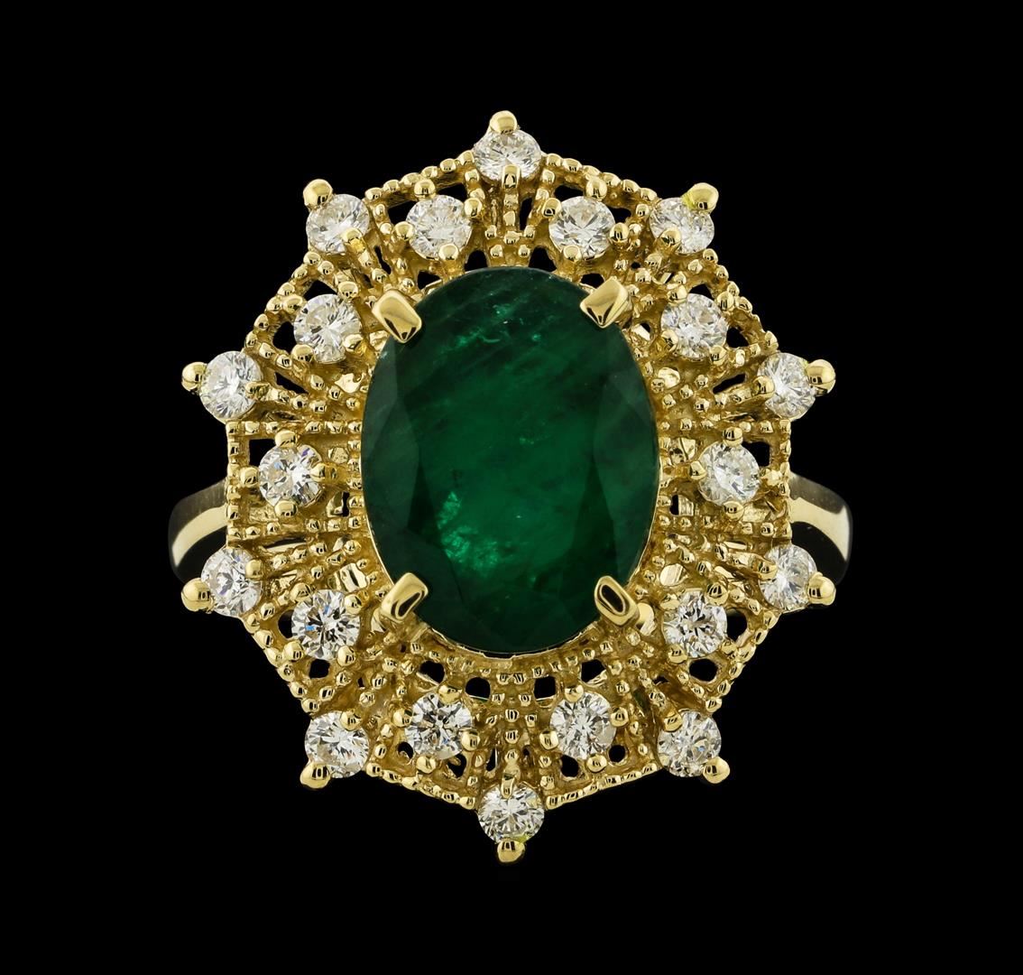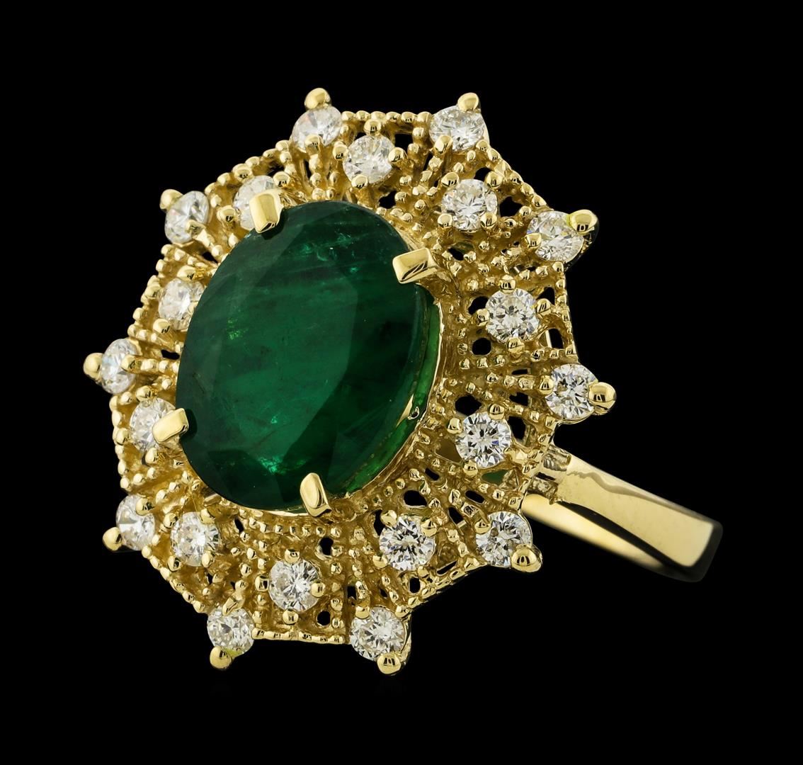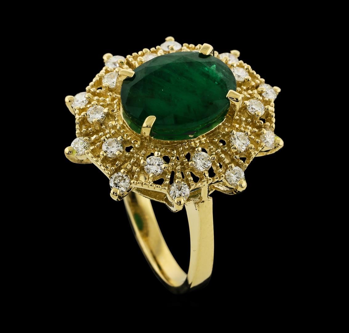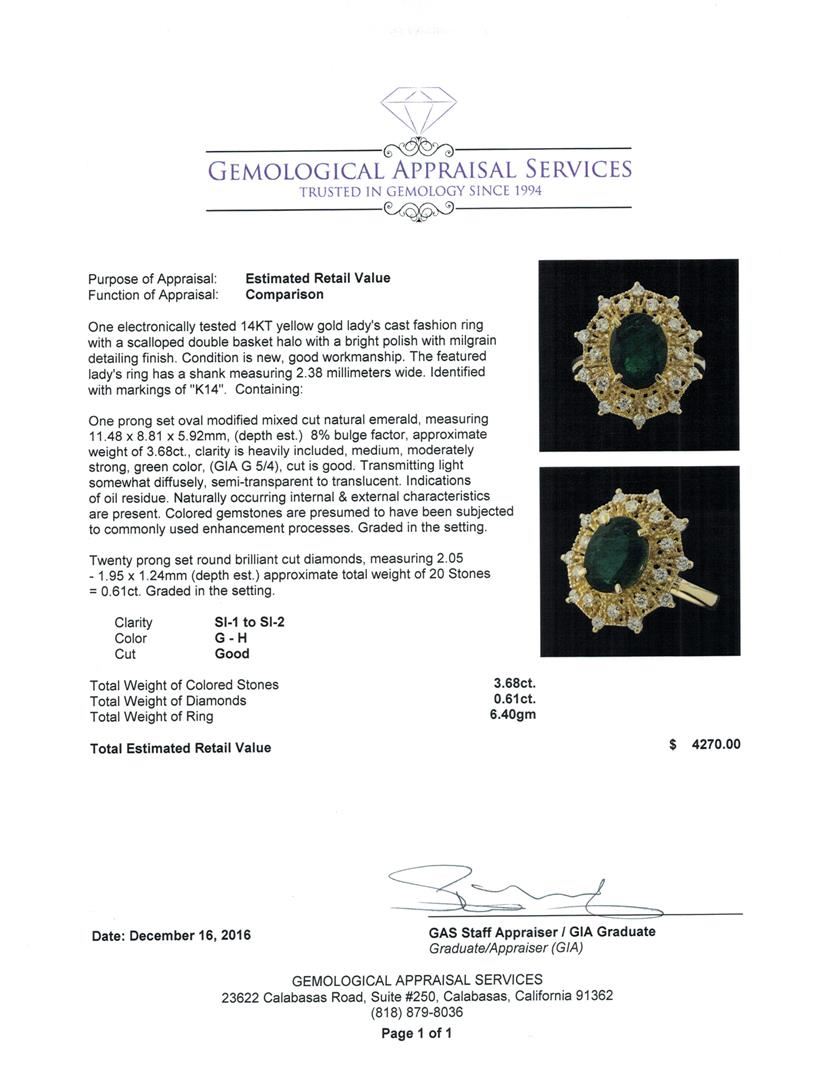 One electronically tested 14KT yellow gold lady's cast fashion ring with a scalloped double basket halo with a bright polish with milgrain detailing finish. The featured lady's ring has a shank measuring 2.38 millimeters wide. Identified with markings of 'K14'. Condition is new, good workmanship. Containing: One prong set oval modified mixed cut natural emerald, measuring 11.48 x 8.81 x 5.92mm, (depth est.) 8%. bulge factor, approximate weight of 3.68ct., clarity is heavily included, medium, moderately strong, green color, (GIA G 5/4), cut is good. Transmitting light somewhat diffusely, semi-transparent to translucent. Indications of oil residue. Naturally occurring internal & external characteristics are present. Colored gemstones are presumed to have been subjected to commonly used enhancement processes. Graded in the setting. Twenty prong set round brilliant cut diamonds, measuring 2.05 - 1.95 x 1.24mm (depth est.) approximate total weight of 20 Stones = 0.61ct. Graded in the setting. Clarity SI-1 to SI-2. Color: G - H Cut Good. Total Weight of Colored Stones 3.68ct.. Total Weight of Diamonds 0.61ct.. Total Weight of Ring 6.40gm. GAS Appraised at $4,270.00.