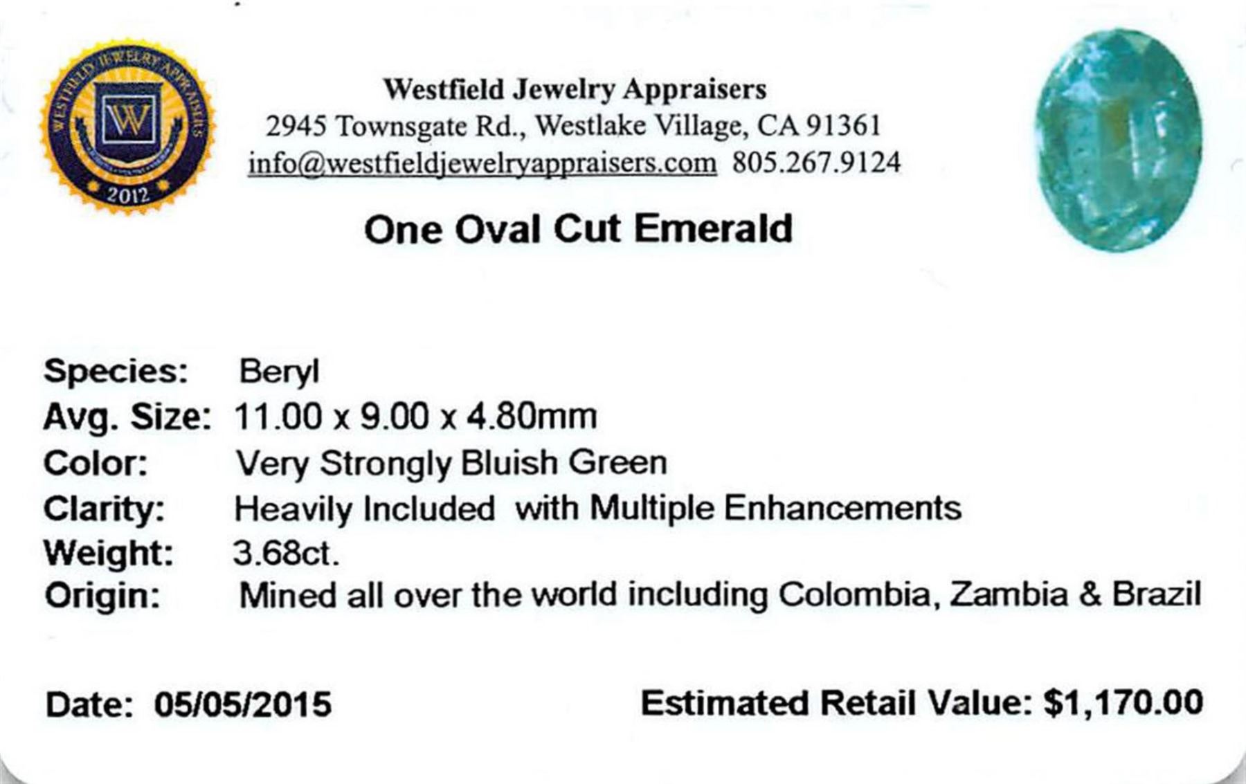 One oval mixed cut natural emerald, measuring 10.70 x 8.10 x 6.60mm, exact weight 3.68ct., clarity is heavily included, type III, dark, very slightly grayish, very strongly bluish green color, (GIA vstbG 7/3), cut is good. Indications of multiple laboratory enhancements, including high temperature heat treatment. Westfield Appraised.