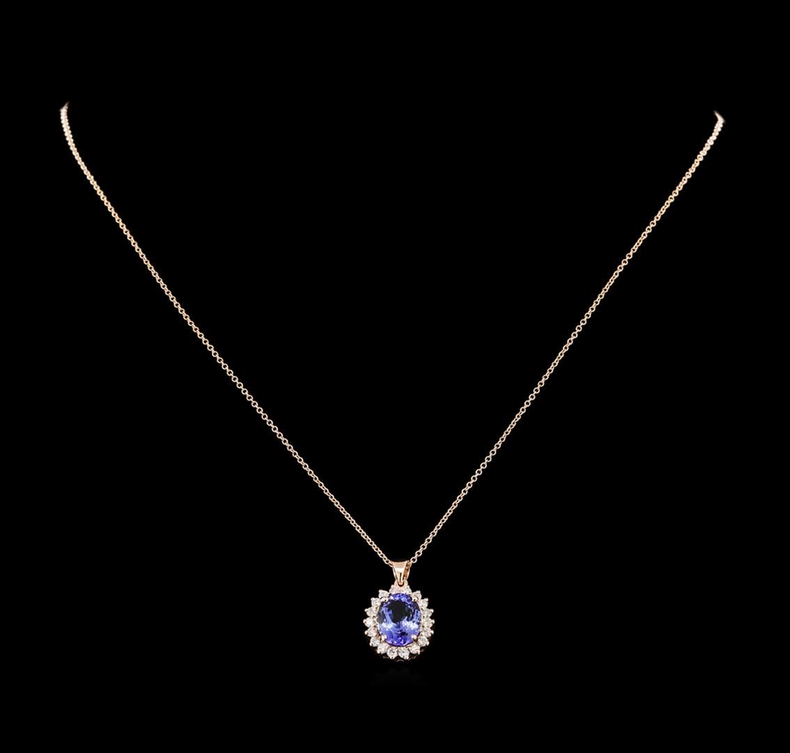 One electronically tested 14KT rose gold lady's combination cast & assembled fashion pendant & chain 18.0' long, 1.3mm round cable link with a lobster claw clasp with a bright polish finish. The featured lady's pendant and chain has a drop measuring 22 millimeters in length. Identified with markings of '14K'. Condition is new, good workmanship. Containing: One prong set oval modified brilliant cut natural tanzanite, measuring 11.15 x 8.77 x 5.49mm, (depth est.) approximate weight of 3.68ct., clarity is eye clean, medium, very slightly grayish, violetish blue color, (GIA vB 5/3), cut is very good. Transmitting light with no distortion, transparent. Colored gemstones are presumed to have been subjected to commonly used enhancement processes. Graded in the setting. Eighteen prong set round brilliant cut diamonds, measuring 2.10 - 2.00 x 1.26mm (depth est.) approximate total weight of 18 Stones = 0.58ct. Graded in the setting. Clarity SI-1 to I-1. Color: H - I Cut Good. Total Weight of Colored Stones 3.68ct.. Total Weight of Diamonds 0.58ct.. Total Weight of Pendant & Chain 5.30gm. GAS Appraised at $7,800.00.