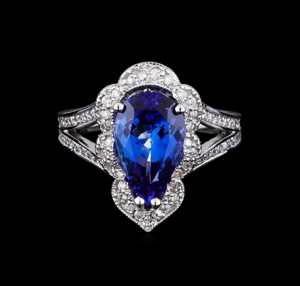 One electronically tested 14KT white gold lady's cast fashion ring with a split shank basket halo with a bright polish with milgrain detailing finish. The featured lady's ring has a shank measuring 2.75 millimeters in width. Identified with markings of "K14". Condition is new, good workmanship. Containing: One prong set pear modified brilliant cut natural tanzanite, measuring 13.00 x 7.95 x 5.64mm, (depth est.) approximate weight of 3.68ct., clarity is eye clean, medium dark, very slightly grayish, bluish violet color, (GIA bV 6/3), cut is very good. Transmitting light with no distortion, transparent. Colored gemstones are presumed to have been subjected to commonly used enhancement processes. Graded in the setting. Twenty-Eight prong set round brilliant cut diamonds, measuring 1.40 - 1.30 x 0.83mm (depth est.) approximate total weight of 28 Stones = 0.24ct. Graded in the setting. Clarity: SI-1 to SI-2. Color: G - Good Forty-Four prong set round brilliant cut diamonds, measuring 1.20 - 1.10 x 0.71mm (depth est.) approximate total weight of 44 Stones = 0.24ct. Graded in the setting. Clarity: VS-2 to SI-2. Color: G - I. Cut Good. Total Weight of Colored Stones 3.68ct. Total Weight of Diamonds 0.48ct. Total Weight of Ring 7.40gm GAS Appraised.