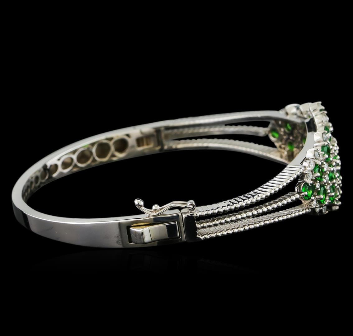 One electronically tested 14KT white gold lady's cast fashion bangle bracelet with a tongue clasp with foldover safety with a bright polish finish. The featured lady's bracelet has a circumference of approximately 7 inches. Identified with markings of "K14". Condition is new, good workmanship. Containing: Twenty-five prong set round modified brilliant cut natural tsavorite garnets, measuring 3.20 - 3.10 x 2.05 mm, approximate total weight of 3.68ct., clarity is eye clean, type II, medium, moderately strong, green color, (GIA G 5/4), cut is very good. Transmitting light with no distortion, transparent. Colored gemstones are presumed to have been subjected to commonly used enhancement processes. Graded in the setting. Eight prong set round brilliant cut diamonds, measuring 2.50 - 2.40 x 1.47mm (depth est.) approximate total weight of 8 Stones = 0.42ct. Graded in the setting. Clarity: SI-1 to SI-2. Color: H - I. Cut Very Good Forty-Six prong set round brilliant cut diamonds, measuring 1.90 - 1.70 x 1.08mm (depth est.) approximate total weight of 46 Stones = 0.98ct. Graded in the setting. Clarity: SI-1 to I-1. Color: G - I. Cut Good Four prong set round brilliant cut diamonds, measuring 1.60 - 1.50 x 0.96mm (depth est.) approximate total weight of 4 Stones = 0.06ct. Graded in the setting. Clarity: SI-2 to I-1. Color: H - I. Cut Good. Total Weight of Colored Stones 3.68ct. Total Weight of Diamonds 1.46ct. Total Weight of Bangle Bracelet 24.40gm. GAS Appraised at $11,095.00.