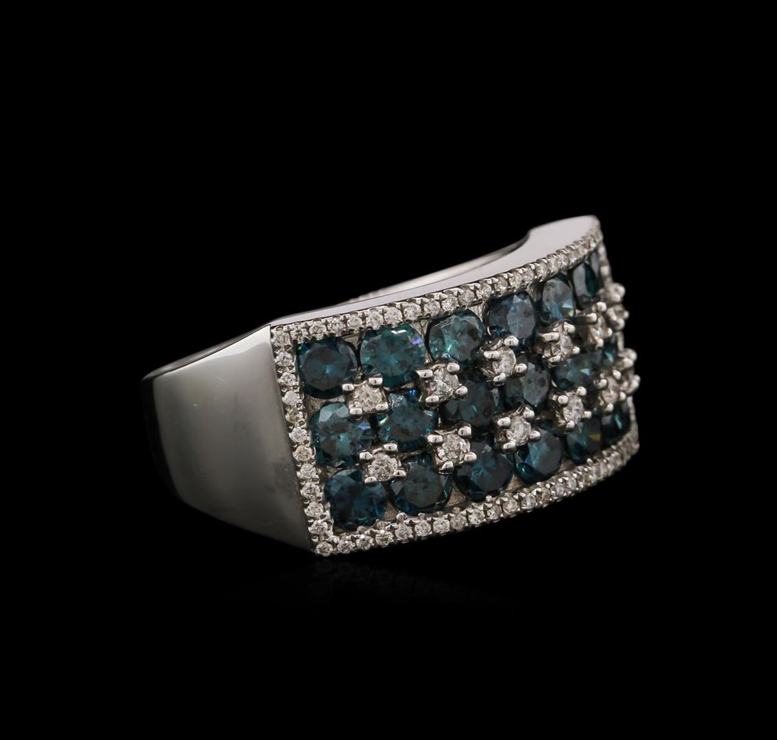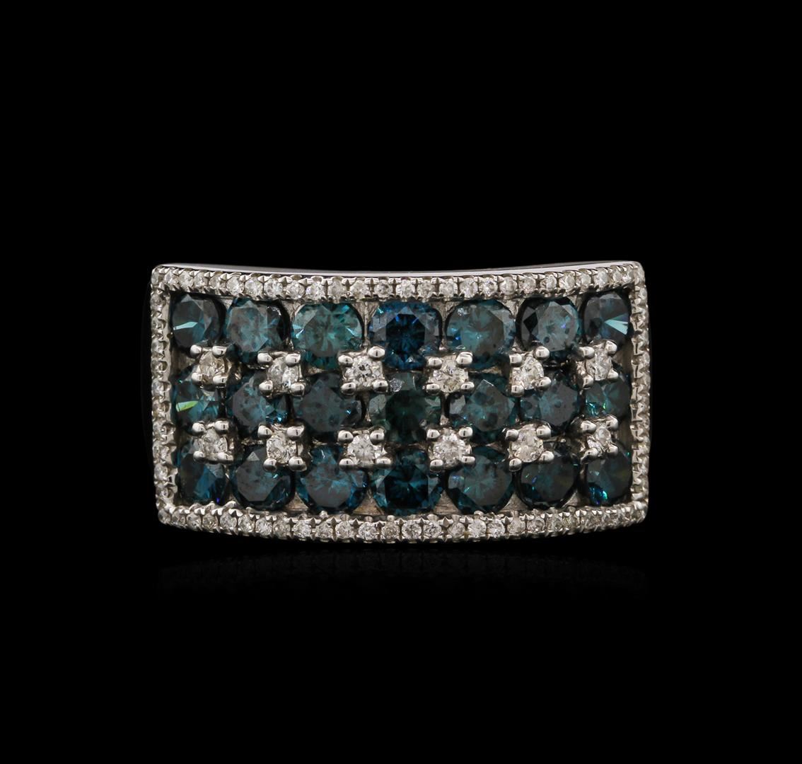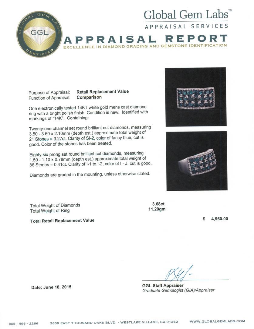One electronically tested 14KT white gold mens cast diamond ring with a bright polish finish. Identified with markings of "14K". Condition is new. Containing: Twenty-One channel set round brilliant cut diamonds, measuring 3.50 - 3.50 x 2.10mm (depth est.) approximate total weight of 21 Stones = 3.27ct. Clarity: SI-2, Cut is Good. Color of the stones has been treated. Eighty-Six prong set round brilliant cut diamonds, measuring 1.50 - 1.10 x 0.78mm (depth est.) approximate total weight of 86 Stones = 0.41ct. Clarity: I-1 to I-2. Color: I - J, Cut is Good. Diamonds are graded in the mounting, unless otherwise stated. Total Weight of Diamonds 3.68ct. Total Weight of Ring 11.20 grams. GGL Appraised at $4,960.00.