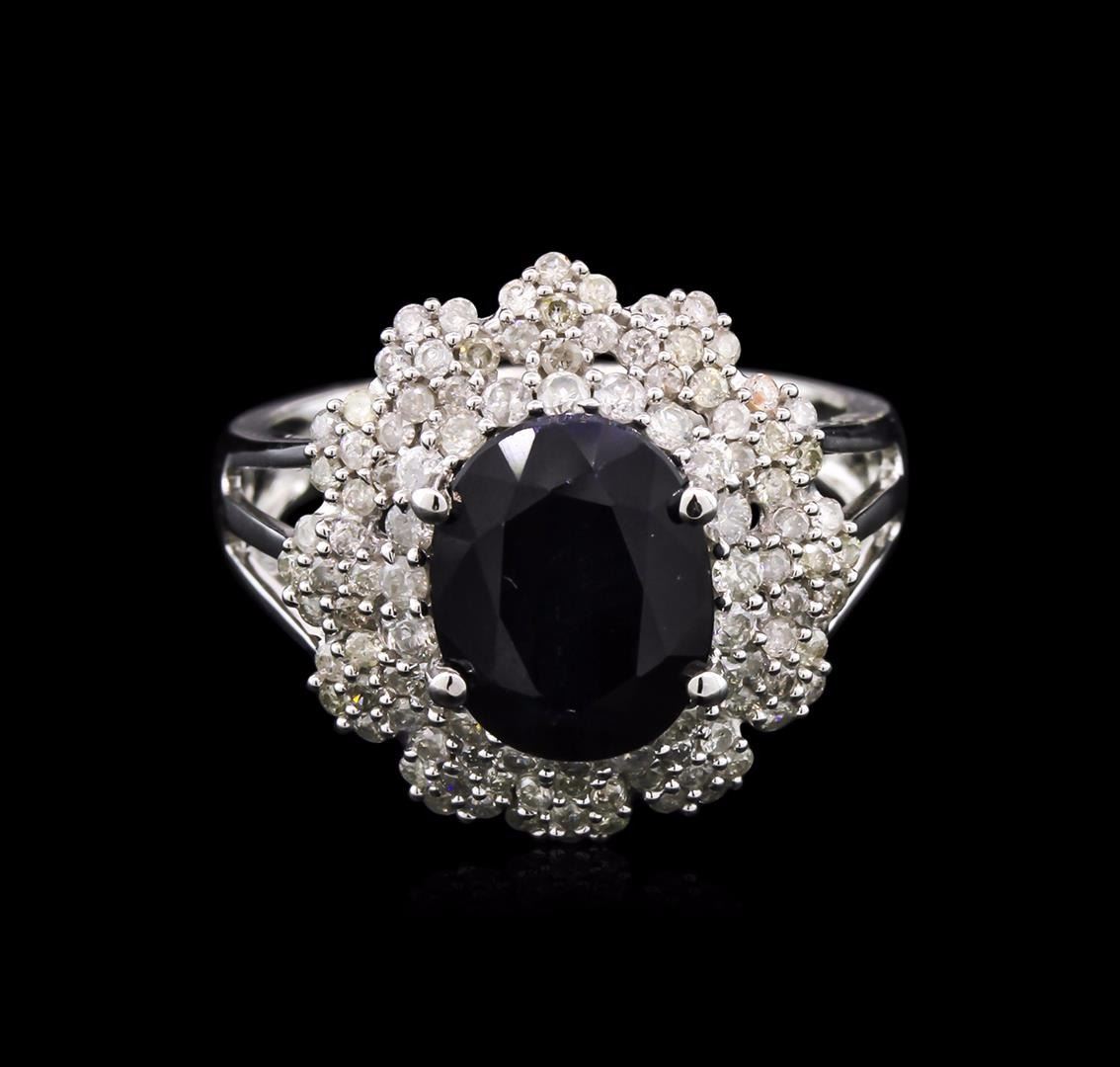One polished, stamped, and tested 14K white gold ring mounted with: 1 genuine sapphire center stone weighing 3.69ct, and 104 genuine round diamonds weighing 0.86ct. This item weighs 4.80 grams, condition is new, excellent workmanship. Main Gemstone: Variety: Sapphire. Species: Natural corundum. Shape: Oval. Quantity: 1 sapphire. Cutting Style: Brilliant cut crown; step cut pavilion. Measurements: 10.12 x 8.04 x 5.06mm. Total Weight: 3.69ct. Color: Dark blue. Cut Grade: Very good. Refractive Index: 1.762-1.770 DR. Birefringence: 0.008-0.010. Hardness: 9. Adjacent Gemstones on Ring: Identity: Natural diamond. Shape: Round. Cutting Style: Brilliant cut. Quantity: 104 diamonds. Measurements: 1.10 - 1.20mm. Total Weight: 0.86ct. Clarity Grade: I1-I2. Color Grade: H-J. Refractive Index: 2.418. Hardness: 10. Total sapphire weight: 3.69ct. Total diamond weight: 0.86ct. Weight of item: 4.80 grams. AIGL Appraised at $9,495.00.