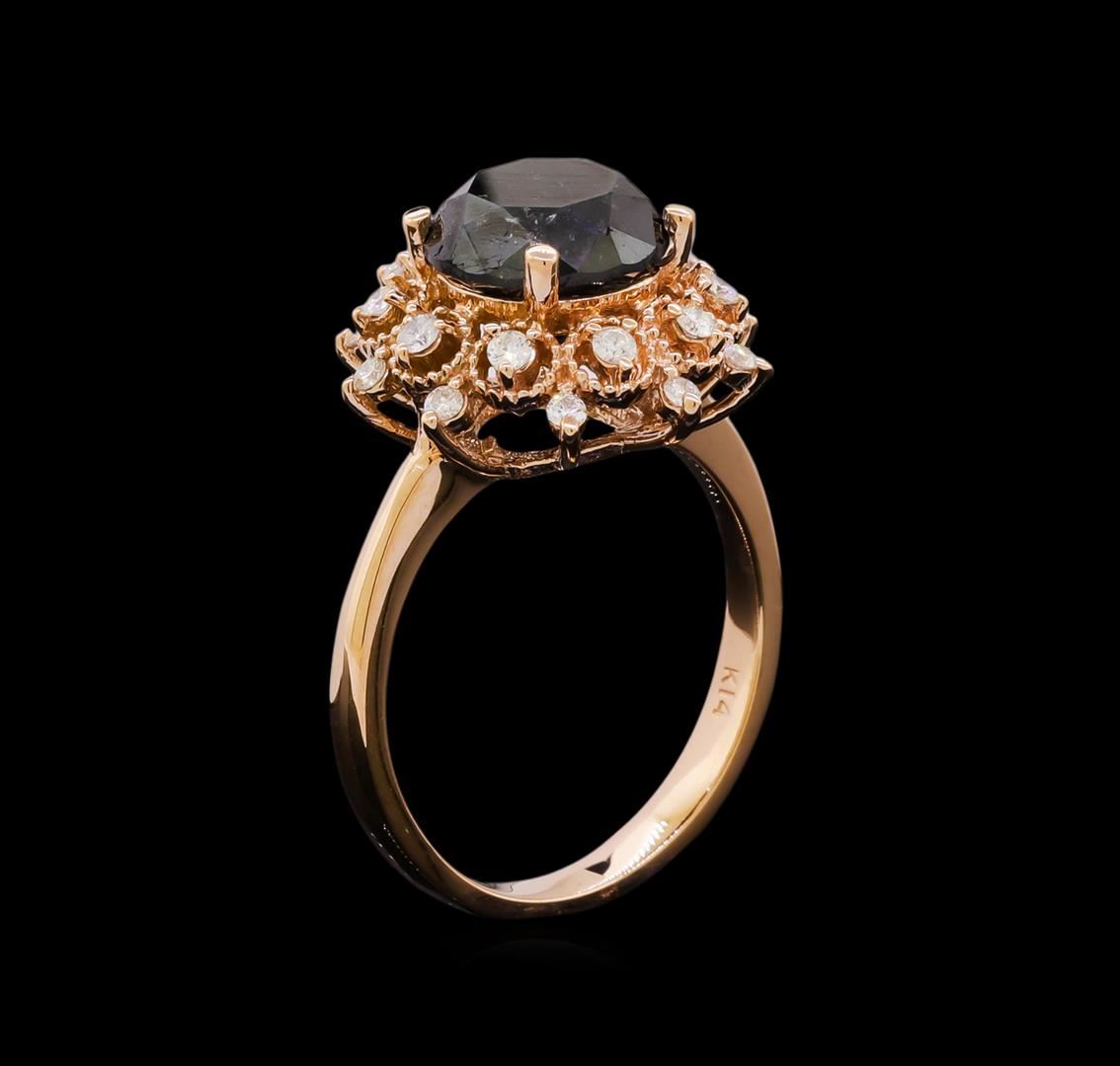 One ring featuring: 14KT rose gold weighing 4.31 grams containing one black diamond center stone with a total weight of 3.45ct and diamonds with a total weight of 0.25ct.
