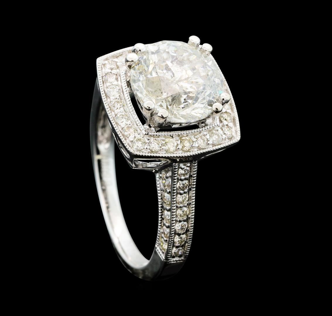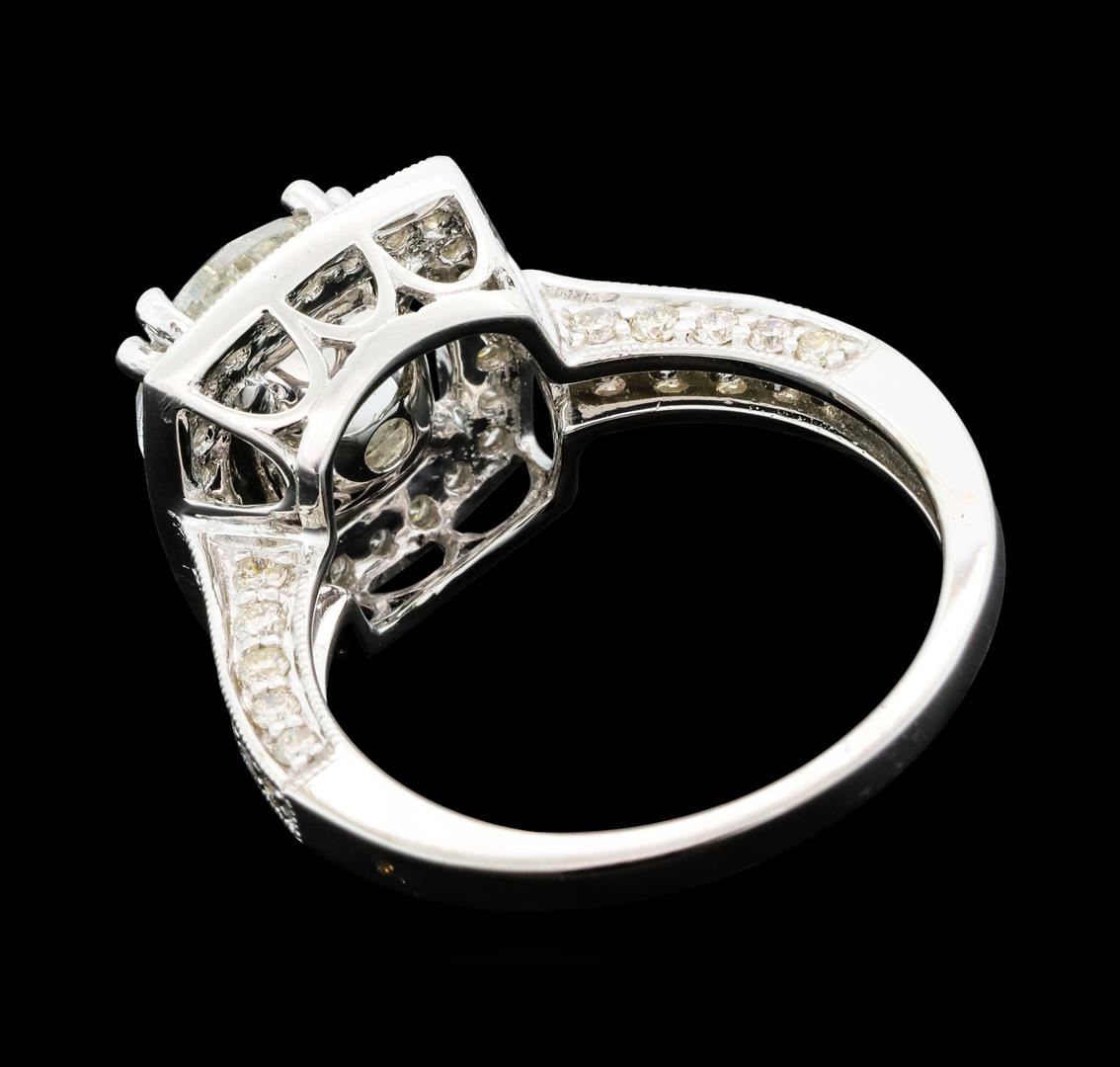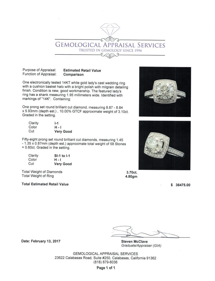 One electronically tested 14KT white gold lady's cast wedding ring with a cushion basket halo with a bright polish with milgrain detailing finish. The featured lady's ring has a shank measuring 1.95 millimeters wide. Identified with markings of '14K'. Condition is new, good workmanship. Containing: One prong set round brilliant cut diamond, measuring 8.87 - 8.84 x 5.93mm (depth est.) , 10.00.%. GTCF approximate weight of 3.10ct. Graded in the setting. Clarity I-1. Color: H - I Cut Very Good Fifty-Eight prong set round brilliant cut diamonds, measuring 1.45 - 1.35 x 0.87mm (depth est.) approximate total weight of 58 Stones = 0.60ct. Graded in the setting. Clarity SI-1 to I-1. Color: H - I Cut Very Good. Total Weight of Diamonds 3.70ct.. Total Weight of Ring 4.80gm. GAS Appraised at $36,475.00.