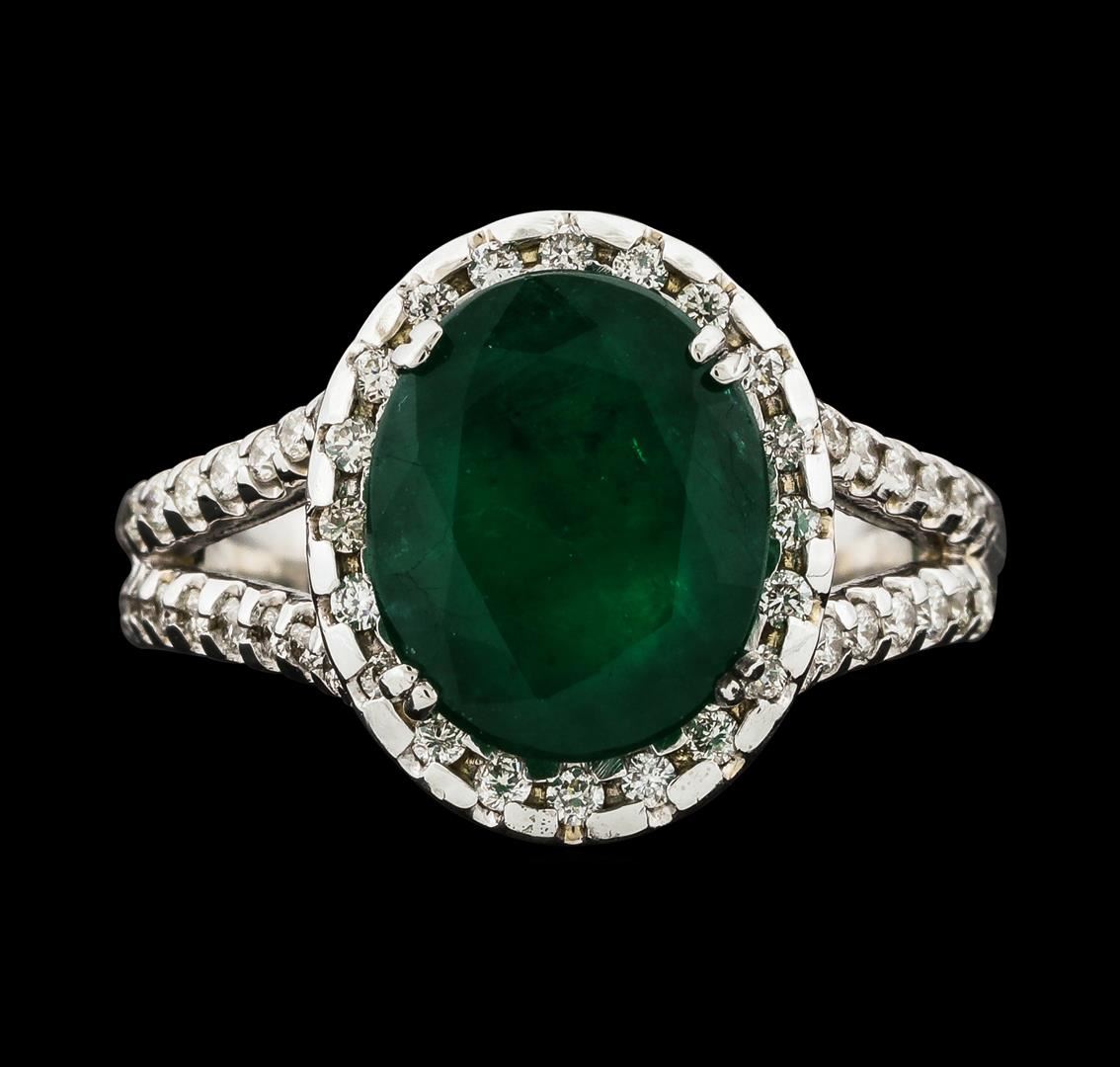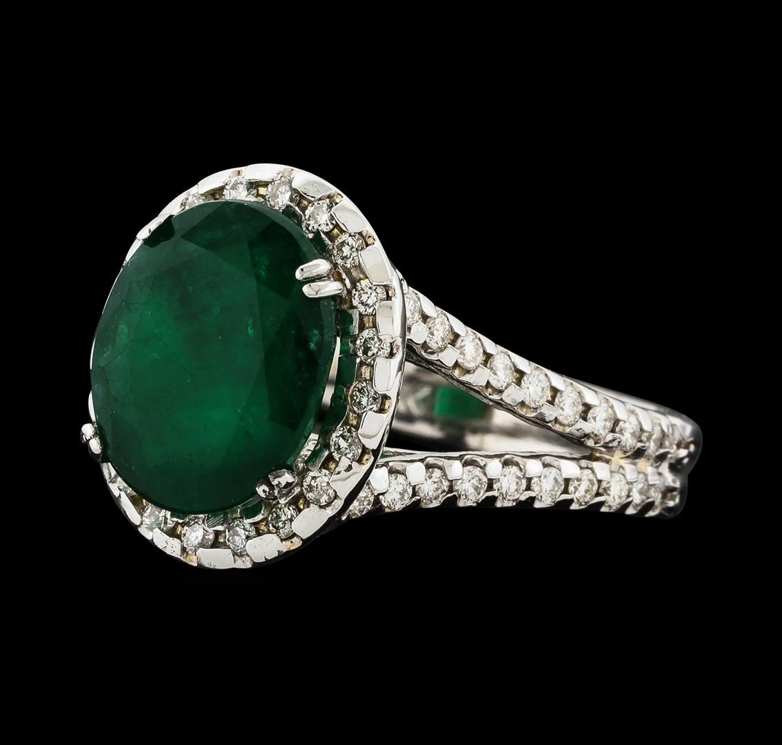 One electronically tested 14KT white gold lady's cast fashion ring with a split cathedral shank with a halo with a bright polish finish. The featured lady's ring has a double shank measuring 3.83 millimeters wide. Identified with markings of '14K'. Condition is new, good workmanship. Containing: One prong set oval modified mixed cut natural emerald, measuring 11.38 x 9.28 x 5.10mm, (depth est.) 20%. bulge factor, approximate weight of 3.70ct., clarity is heavily included, medium dark, moderately strong, green color, (GIA G 6/4), cut is good. Transmitting light somewhat diffusely, semi-transparent to translucent. Naturally occurring internal & external characteristics are present. Indications of oil residue. Colored gemstones are presumed to have been subjected to commonly used enhancement processes. Graded in the setting. Sixty prong set round brilliant cut diamonds, measuring 1.40 - 1.35 x 0.86mm (depth est.) approximate total weight of 60 Stones = 0.60ct. Graded in the setting. Clarity VS-2 to SI-2. Color: H - I Cut Good. Total Weight of Colored Stones 3.70ct.. Total Weight of Diamonds 0.60ct.. Total Weight of Ring 7.30gm. GAS Appraised at $5,575.00.