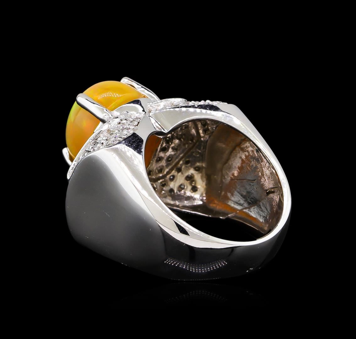 One electronically tested 14KT white gold ladies cast opal and diamond ring with a bright polish finish. The featured opal is set between mirroring stylized diamond galleries supported by tapering shoulders, completed by a four millimeter wide band. Identified with markings of "K14". Condition is new, good workmanship. Containing: One semi crystal opal that is cut in a oval shaped cabochon and is prong set, measuring 11.00 mm long x 9.00 mm wide, and 7.00 mm thick and the approximate weight is 3.70 carats. The opal has a somewhat bright, red multicolor play of color (fire) in a flashfire pattern; a high dome; a good cut; no inclusions; consistent in its brightness and pattern; and is slightly directional. Graded in the setting. Seventy-Eight prong set round brilliant cut diamonds approximate total weight of 78 Stones = 0.75ct. Graded in the setting. Clarity: SI-1 to I-1. Color: E - F. Total Weight of Diamonds 0.75ct. Total Weight of Opals 3.70ct. Total Weight of Ring 11.15gm. AIG Appraised at $5,295.00.