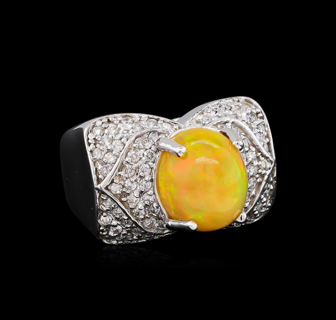 One electronically tested 14KT white gold ladies cast opal and diamond ring with a bright polish finish. The featured opal is set between mirroring stylized diamond galleries supported by tapering shoulders, completed by a four millimeter wide band. Identified with markings of "K14". Condition is new, good workmanship. Containing: One semi crystal opal that is cut in a oval shaped cabochon and is prong set, measuring 11.00 mm long x 9.00 mm wide, and 7.00 mm thick and the approximate weight is 3.70 carats. The opal has a somewhat bright, red multicolor play of color (fire) in a flashfire pattern; a high dome; a good cut; no inclusions; consistent in its brightness and pattern; and is slightly directional. Graded in the setting. Seventy-Eight prong set round brilliant cut diamonds approximate total weight of 78 Stones = 0.75ct. Graded in the setting. Clarity: SI-1 to I-1. Color: E - F. Total Weight of Diamonds 0.75ct. Total Weight of Opals 3.70ct. Total Weight of Ring 11.15gm. AIG Appraised at $5,295.00.