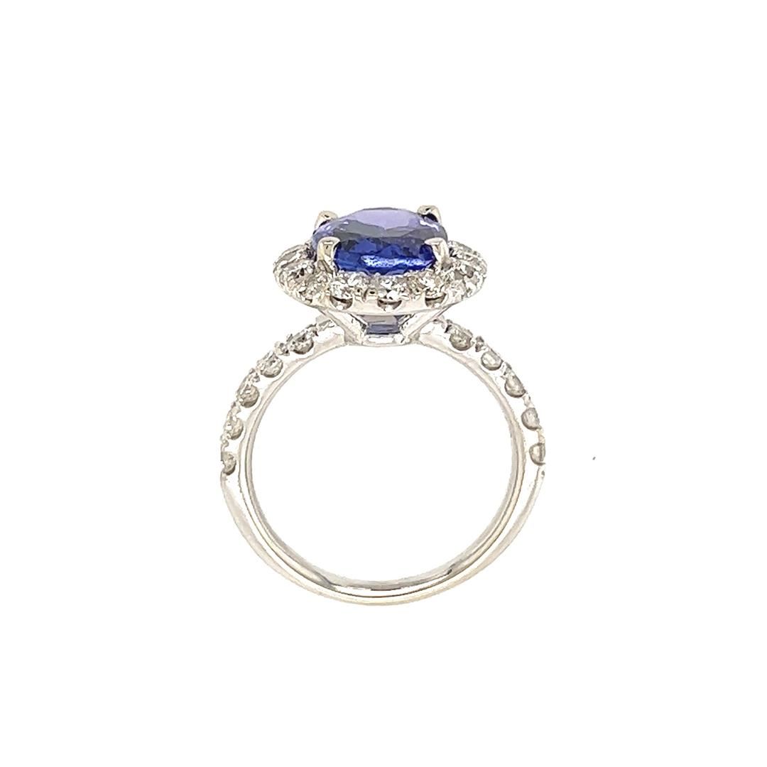 One electronically tested 14KT white gold lady's cast fashion ring with a basket halo with a bright polish finish. Condition is new, good workmanship. The featured lady's ring has a shank measuring 2.10 millimeters wide. Identified with markings of "14K". Containing: One prong set oval modified mixed cut natural tanzanite, measuring 11.58 x 8.60 x 5.30mm, (depth est.) approximate weight of 3.70ct., clarity is eye clean, medium dark, moderately strong, violetish blue color, (GIA vB 6/4), cut is very good. Transmitting light with no distortion, transparent. Colored gemstones are presumed to have been subjected to commonly used enhancement processes. Graded in the setting. Twenty-six prong set round brilliant cut diamonds, measuring 2.40 - 2.25 x 1.45mm (depth est.) approximate total weight of 26 Stones = 1.34ct. Graded in the setting. Color H - I Clarity VS-2 to SI-2 Cut Very Good Total Weight of Colored Stones Total Weight of Diamonds Total Weight of Ring 3.70ct. 1.34ct. 5.00gm Appraisal No: 000022197010 Total Estimated Retail Value $ 9990.00