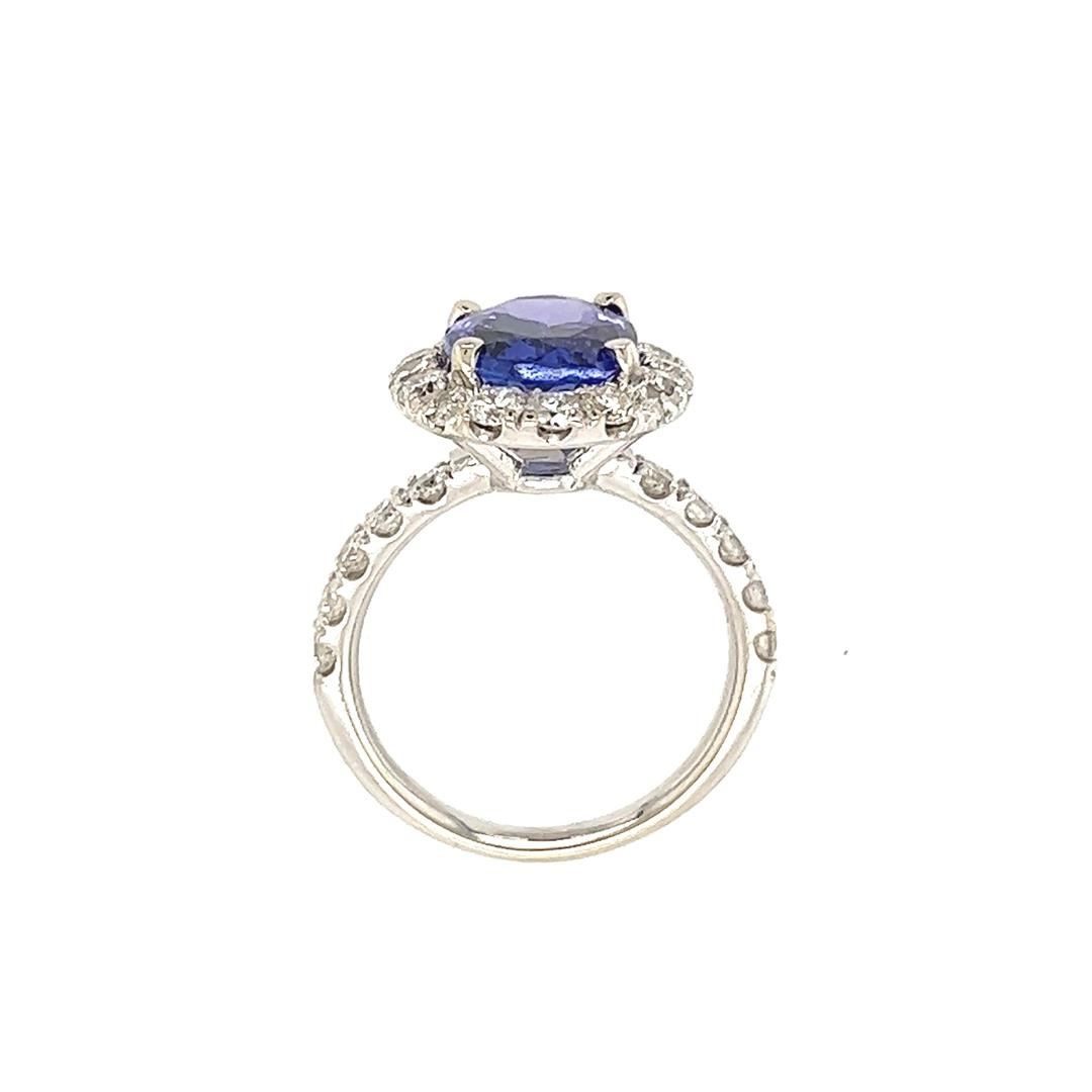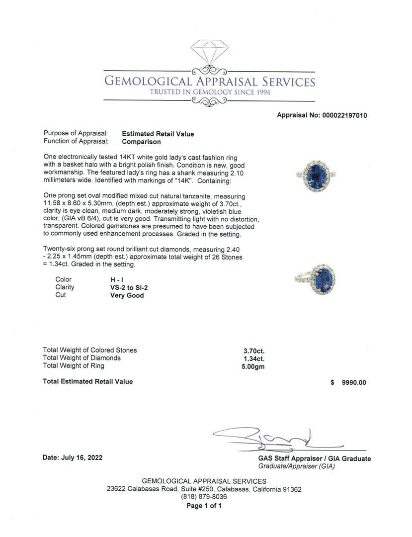 One electronically tested 14KT white gold lady's cast fashion ring with a basket halo with a bright polish finish. Condition is new, good workmanship. The featured lady's ring has a shank measuring 2.10 millimeters wide. Identified with markings of "14K". Containing: One prong set oval modified mixed cut natural tanzanite, measuring 11.58 x 8.60 x 5.30mm, (depth est.) approximate weight of 3.70ct., clarity is eye clean, medium dark, moderately strong, violetish blue color, (GIA vB 6/4), cut is very good. Transmitting light with no distortion, transparent. Colored gemstones are presumed to have been subjected to commonly used enhancement processes. Graded in the setting. Twenty-six prong set round brilliant cut diamonds, measuring 2.40 - 2.25 x 1.45mm (depth est.) approximate total weight of 26 Stones = 1.34ct. Graded in the setting. Color H - I Clarity VS-2 to SI-2 Cut Very Good Total Weight of Colored Stones Total Weight of Diamonds Total Weight of Ring 3.70ct. 1.34ct. 5.00gm Appraisal No: 000022197010 Total Estimated Retail Value $ 9990.00