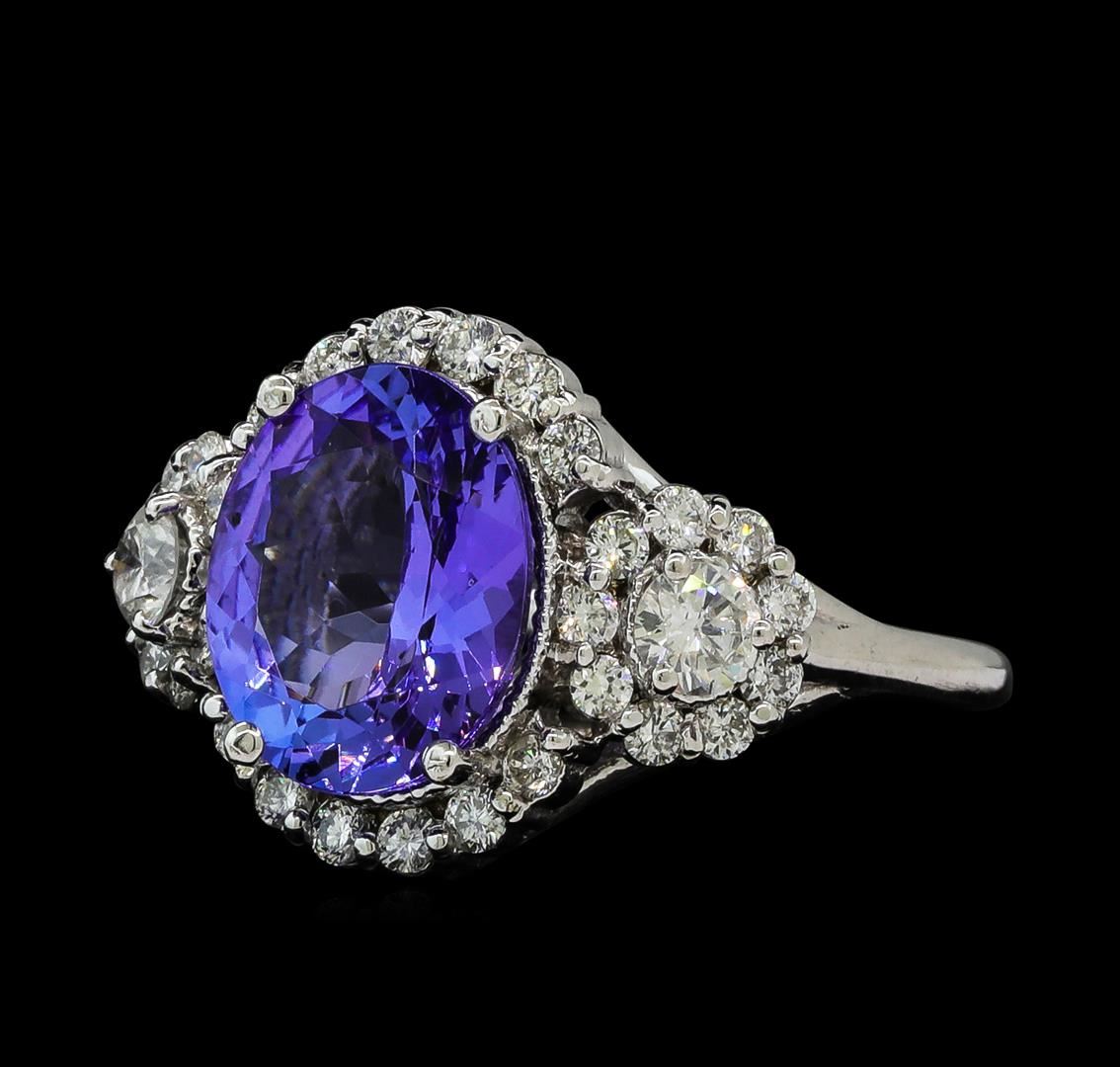 One electronically tested 14KT white gold lady's cast fashion ring with a cathedral halo with a bright polish finish. The featured lady's ring has a shank measuring 1.85 millimeters wide. Identified with markings of '14K'. Condition is new, good workmanship. Containing: One prong set oval modified brilliant cut natural tanzanite, measuring 11.35 x 9.28 x 5.19mm, (depth est.) approximate weight of 3.70ct., clarity is eye clean, medium light, moderately strong, violetish blue color, (GIA vB 4/4), cut is very good. Transmitting light with no distortion, transparent. Colored gemstones are presumed to have been subjected to commonly used enhancement processes. Graded in the setting. Two prong set round brilliant cut diamonds, measuring 3.50 - 3.40 x 2.07mm (depth est.) approximate total weight of 2 Stones = 0.30ct. Graded in the setting. Clarity SI-2. Color: H - I Cut Good Thirty prong set round brilliant cut diamonds, measuring 1.80 - 1.70 x 1.05mm (depth est.) approximate total weight of 30 Stones = 0.58ct. Graded in the setting. Clarity SI-1 to I-1. Color: H - I Cut Good. Total Weight of Colored Stones 3.70ct.. Total Weight of Diamonds 0.88ct.. Total Weight of Ring 6.60gm. GAS Appraised at $8,185.00.
