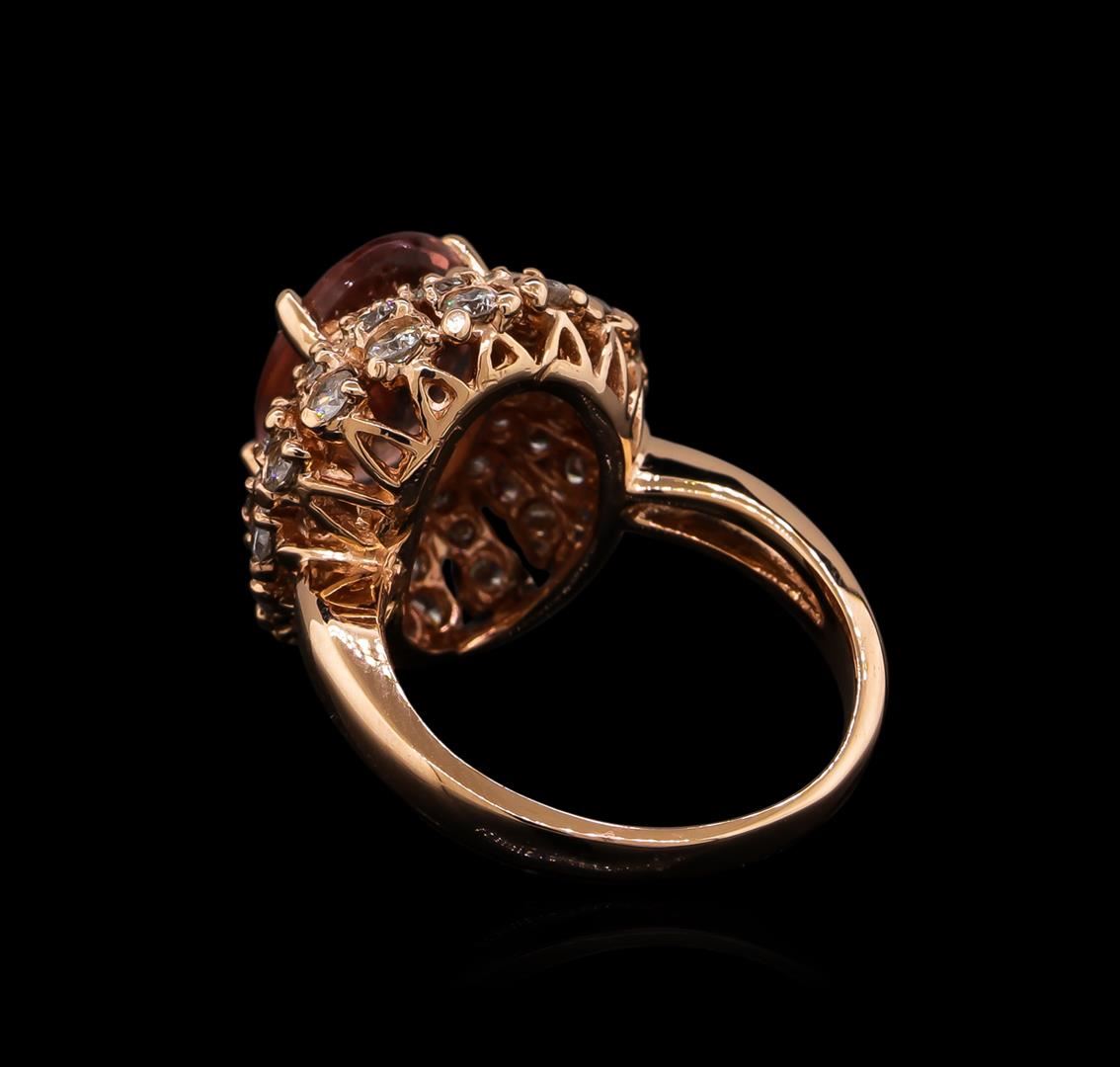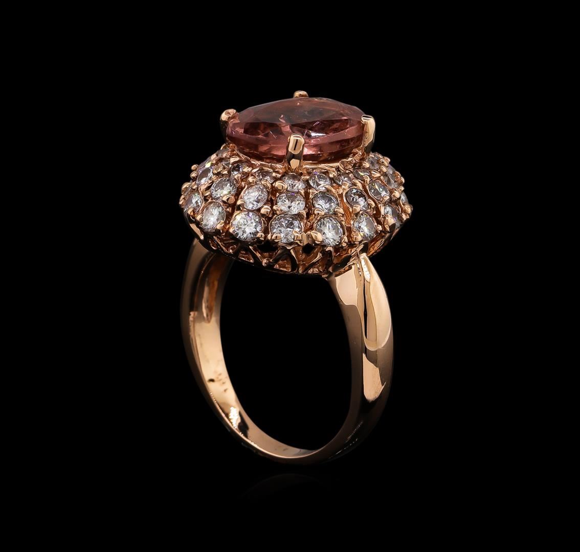 One electronically tested 14KT rose gold lady's cast dome style ring with a triple basket halo with a bright polish finish. The featured lady's ring has a shank measuring 2.20 millimeters wide. Identified with markings of "14K". Condition is like new, good workmanship. Containing: One prong set oval modified brilliant cut natural tourmaline, measuring 12.19 x 8.82 x 4.59mm, 15%. bulge factor, approximate weight of 3.70 ct., clarity is slightly included, medium, very slightly brownish, orangy red color, (GIA oR 5/3), cut is good. Transmitting light with a minimum of distortion, transparent. Colored gemstones are presumed to have been subjected to commonly used enhancement processes. Graded in the setting. Sixteen prong set round brilliant cut diamonds, measuring 2.30 - 2.20 x 1.40mm (depth est.) approximate total weight of 16 Stones = 0.70 ct. Graded in the setting. Clarity: SI-1 to SI-2. Color: H - I. Cut Good Sixteen prong set round brilliant cut diamonds, measuring 2.10 - 2.05 x 1.29mm (depth est.) approximate total weight of 16 Stones = 0.56ct. Graded in the setting. Clarity: SI-1 to SI-2. Color: H - I. Cut Good Sixteen prong set round brilliant cut diamonds, measuring 1.90 - 1.80 x 1.15mm (depth est.) approximate total weight of 16 Stones = 0.39ct. Graded in the setting. Clarity: VS-2 to SI-1. Color: H - I. Cut Good. Total Weight of Colored Stones 3.70 ct. Total Weight of Diamonds 1.65ct. Total Weight of Ring 7.90gm GAS Appraised.