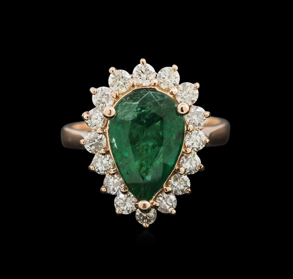 One electronically tested 14KT rose gold lady's cast fashion ring with a halo with a bright polish finish. The featured lady's ring has a shank measuring 2.40 millimeters wide. Identified with markings of "K14". Condition is new, good workmanship. Containing: One prong set pear modified brilliant cut natural emerald, measuring 12.80 x 8.33 x 5.88mm, 8% bulge factor, approximate weight of 3.70ct., clarity is heavily included, type III, dark, moderately strong, very slightly bluish green color, (GIA vslbG 7/4), cut is good. Transmitting light somewhat diffusely, semi-transparent to translucent. Naturally occurring internal & external characteristics are present. Indications of oil residue. Graded in the setting. Sixteen prong set round brilliant cut diamonds, measuring 2.60 - 2.50 x 1.53mm (depth est.) approximate total weight of 16 Stones = 0.98ct. Graded in the setting. Clarity: SI-2 to I-1. Color: G - I. Cut Good. Total Weight of Colored Stones 3.70ct. Total Weight of Diamonds 0.98ct. Total Weight of Ring 5.90gm. GAS Appraised at $7,570.00.