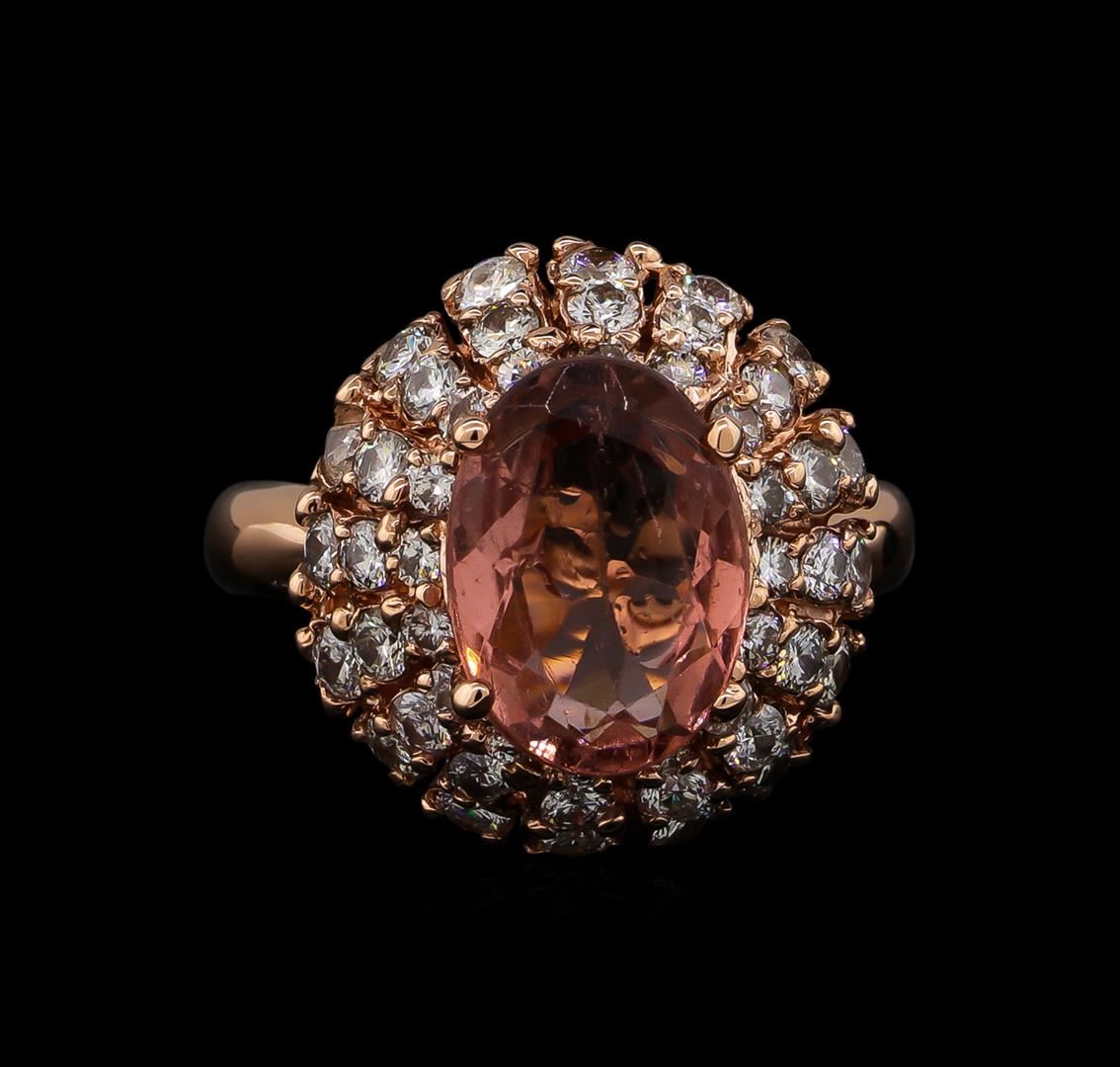 One electronically tested 14KT rose gold lady's cast dome style ring with a triple basket halo with a bright polish finish. The featured lady's ring has a shank measuring 2.20 millimeters wide. Identified with markings of "14K". Condition is like new, good workmanship. Containing: One prong set oval modified brilliant cut natural tourmaline, measuring 12.19 x 8.82 x 4.59mm, 15%. bulge factor, approximate weight of 3.70ct., clarity is slightly included, medium, very slightly brownish, orangy red color, (GIA oR 5/3), cut is good. Transmitting light with a minimum of distortion, transparent. Colored gemstones are presumed to have been subjected to commonly used enhancement processes. Graded in the setting. Sixteen prong set round brilliant cut diamonds, measuring 2.30 - 2.20 x 1.40mm (depth est.) approximate total weight of 16 Stones = 0.70ct. Graded in the setting. Clarity: SI-1 to SI-2. Color: H - I. Cut Good Sixteen prong set round brilliant cut diamonds, measuring 2.10 - 2.05 x 1.29mm (depth est.) approximate total weight of 16 Stones = 0.56ct. Graded in the setting. Clarity: SI-1 to SI-2. Color: H - I. Cut Good Sixteen prong set round brilliant cut diamonds, measuring 1.90 - 1.80 x 1.15mm (depth est.) approximate total weight of 16 Stones = 0.39ct. Graded in the setting. Clarity: VS-2 to SI-1. Color: H - I. Cut Good. Total Weight of Colored Stones 3.70ct. Total Weight of Diamonds 1.65ct. Total Weight of Ring 7.90gm GAS Appraised.