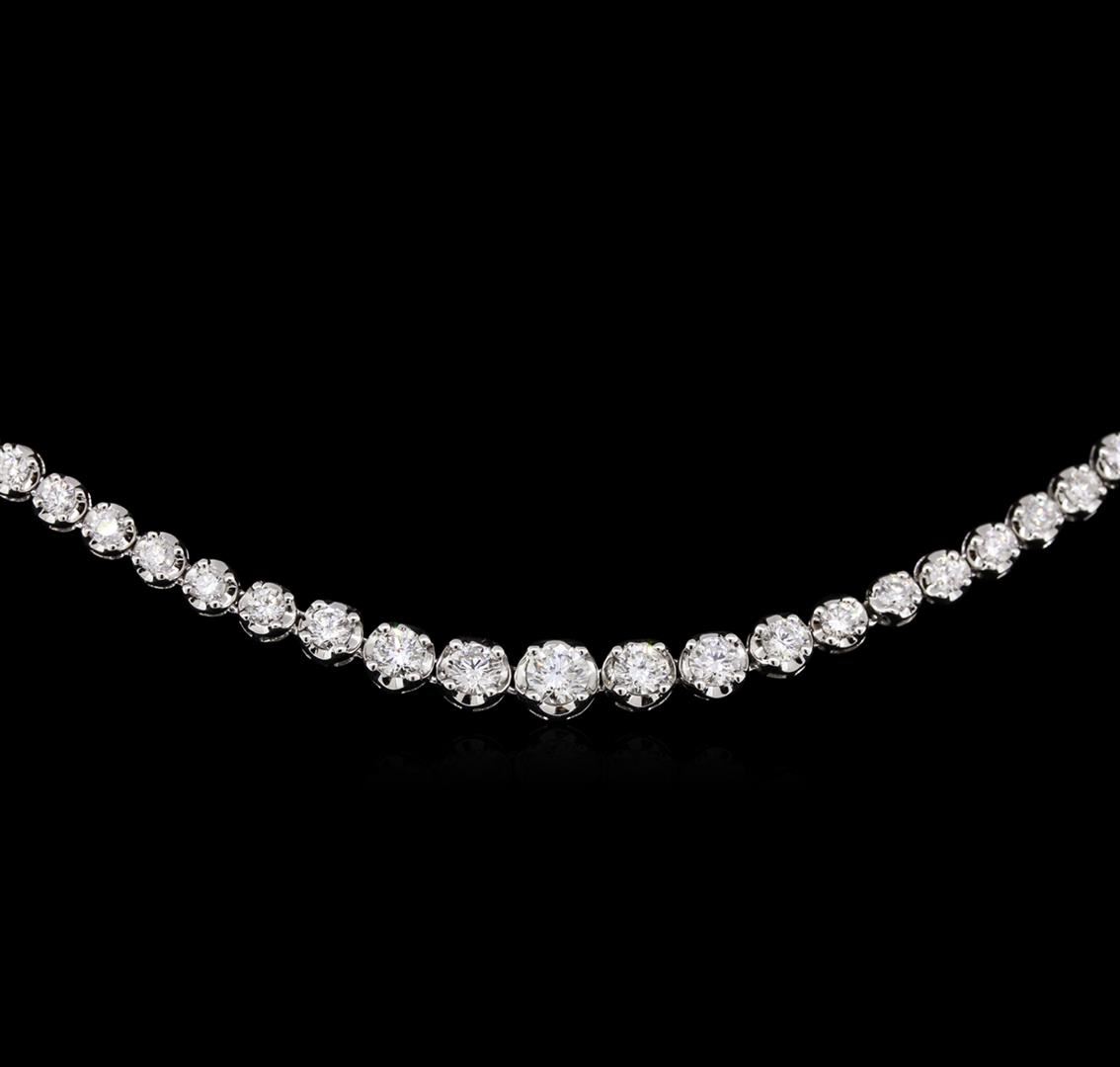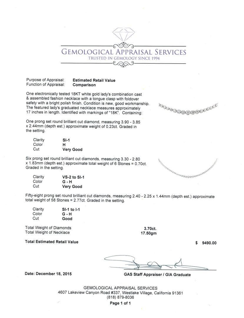 One electronically tested 18KT white gold lady's combination cast & assembled fashion necklace with a tongue clasp with foldover safety with a bright polish finish. The featured lady's graduated necklace measures approximately 17 inches in length. Identified with markings of "18K". Condition is new, good workmanship. Containing: One prong set round brilliant cut diamond, measuring 3.90 - 3.85 x 2.44mm (depth est.) approximate weight of 0.23ct. Graded in the setting. Clarity: SI-1. Color: Very Good Six prong set round brilliant cut diamonds, measuring 3.30 - 2.80 x 1.83mm (depth est.) approximate total weight of 6 Stones = 0.70ct. Graded in the setting. Clarity: VS-2 to SI-1. Color: G - Very Good Fifty-Eight prong set round brilliant cut diamonds, measuring 2.40 - 2.25 x 1.44mm (depth est.) approximate total weight of 58 Stones = 2.77ct. Graded in the setting. Clarity: SI-1 to I-1. Color: G - Good. Total Weight of Diamonds 3.70ct. Total Weight of Necklace 17.50gm. GAS Appraised at $9,490.00.