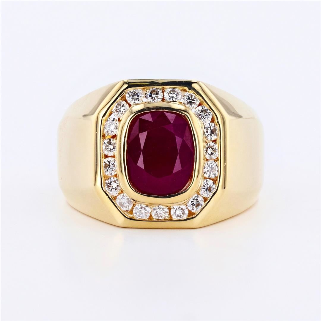 3.71ct Ruby and 0.62ctw Diamond 14K Yellow Gold Ring. Please see Photos and Description for all available information. This ring features a 2.5ct cushion cut ruby and 18 round diamonds weighing a total of 0.62ct. The ring is a size 10 and is crafted in 14K yellow gold.