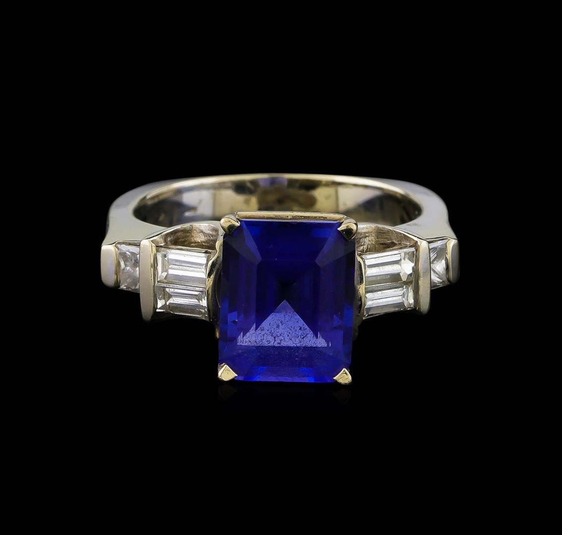 One electronically tested 18KT white gold lady's cast fashion ring with a 3-stone European shank with a bright polish finish. The featured lady's ring has a shank measuring 3.05 millimeters wide. Identified with markings of "18K". Condition is new, good workmanship. Containing: One prong set emerald modified step cut natural tanzanite, measuring 9.84 x 7.89 x 5.43mm, (depth est.) approximate weight of 3.71ct., clarity is eye clean, medium, moderately strong, violetish blue color, (GIA vB 5/4), cut is very good. Transmitting light with no distortion, transparent. Colored gemstones are presumed to have been subjected to commonly used enhancement processes. Graded in the setting. Four channel set baguette cut diamonds, measuring from 4.00 x 1.40 x 1.30mm (depth est.) to 4.10 x 1.45 x 1.50mm (depth est.) approximate total weight of 4 Stones = 0.30ct. Graded in the setting. Clarity: VS-1 to VS-2. Color: G - Very Good Two channel set princess cut diamonds, measuring 2.85 x 2.80 x 2.00mm (depth est.) approximate total weight of 2 Stones = 0.26ct. Graded in the setting. Clarity: VS-1 to VS-2. Color: H - I. Cut Very Good. Total Weight of Colored Stones 3.71ct. Total Weight of Diamonds 0.56ct. Total Weight of Ring 7.40gm. GAS Appraised at $7,745.00.