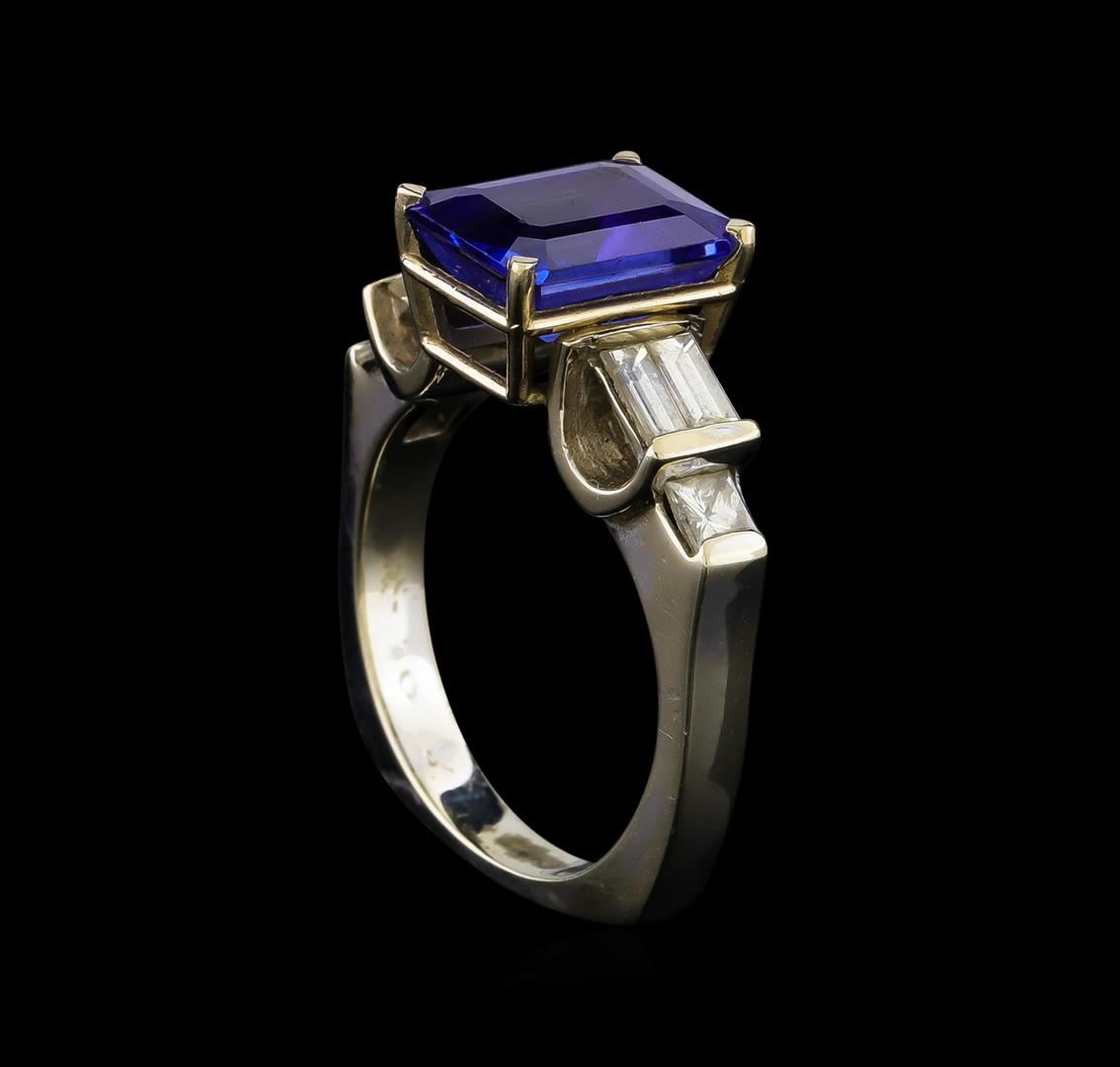 One electronically tested 18KT white gold lady's cast fashion ring with a 3-stone European shank with a bright polish finish. The featured lady's ring has a shank measuring 3.05 millimeters wide. Identified with markings of "18K". Condition is new, good workmanship. Containing: One prong set emerald modified step cut natural tanzanite, measuring 9.84 x 7.89 x 5.43mm, (depth est.) approximate weight of 3.71ct., clarity is eye clean, medium, moderately strong, violetish blue color, (GIA vB 5/4), cut is very good. Transmitting light with no distortion, transparent. Colored gemstones are presumed to have been subjected to commonly used enhancement processes. Graded in the setting. Four channel set baguette cut diamonds, measuring from 4.00 x 1.40 x 1.30mm (depth est.) to 4.10 x 1.45 x 1.50mm (depth est.) approximate total weight of 4 Stones = 0.30ct. Graded in the setting. Clarity: VS-1 to VS-2. Color: G - Very Good Two channel set princess cut diamonds, measuring 2.85 x 2.80 x 2.00mm (depth est.) approximate total weight of 2 Stones = 0.26ct. Graded in the setting. Clarity: VS-1 to VS-2. Color: H - I. Cut Very Good. Total Weight of Colored Stones 3.71ct. Total Weight of Diamonds 0.56ct. Total Weight of Ring 7.40gm. GAS Appraised at $7,745.00.
