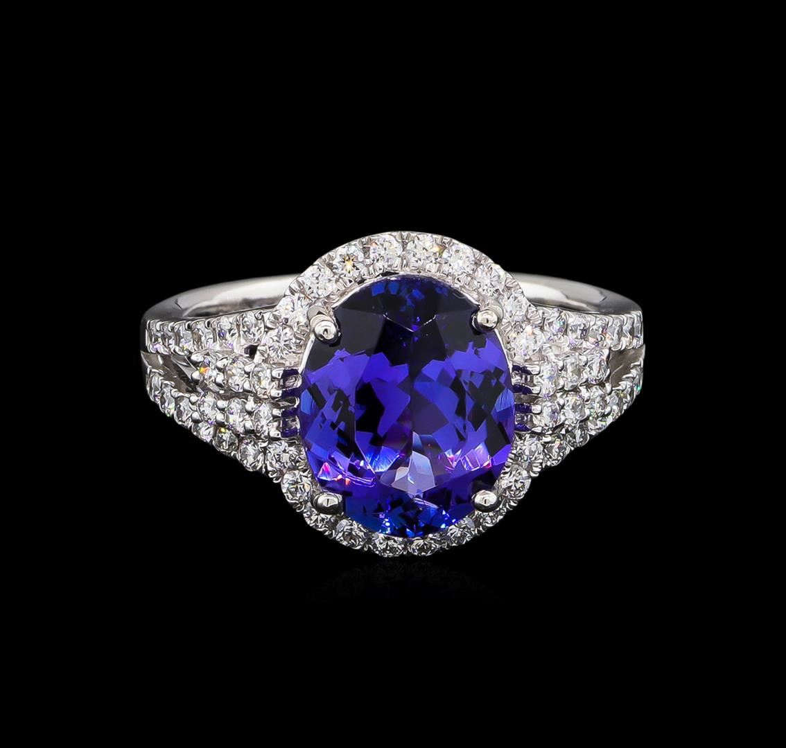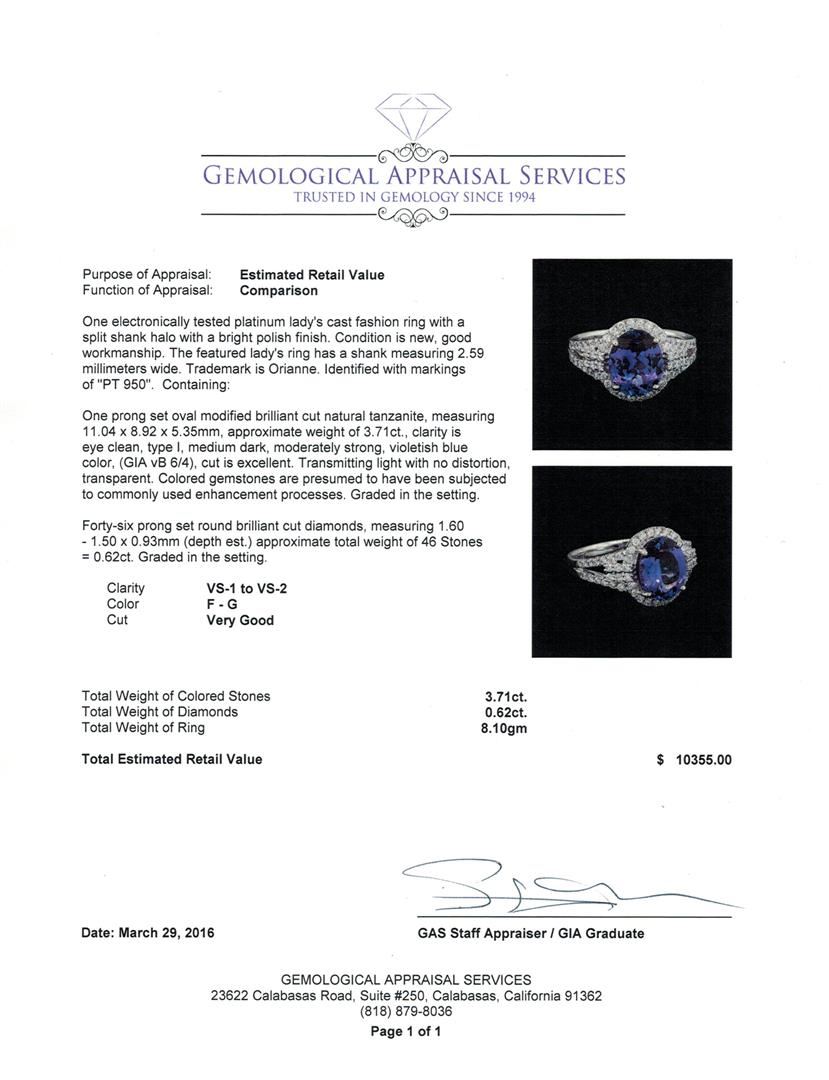 One electronically tested platinum lady's cast fashion ring with a split shank halo with a bright polish finish. The featured lady's ring has a shank measuring 2.59 millimeters wide. Trademark is Orianne. Identified with markings of "PT 950". Condition is new, good workmanship. Containing: One prong set oval modified brilliant cut natural tanzanite, measuring 11.04 x 8.92 x 5.35mm, approximate weight of 3.71ct., clarity is eye clean, type I, medium dark, moderately strong, violetish blue color, (GIA vB 6/4), cut is excellent. Transmitting light with no distortion, transparent. Colored gemstones are presumed to have been subjected to commonly used enhancement processes. Graded in the setting. Forty-Six prong set round brilliant cut diamonds, measuring 1.60 - 1.50 x 0.93mm (depth est.) approximate total weight of 46 Stones = 0.62ct. Graded in the setting. Clarity: VS-1 to VS-2. Color: F - Very Good. Total Weight of Colored Stones 3.71ct. Total Weight of Diamonds 0.62ct. Total Weight of Ring 8.10gm. GAS Appraised at $10,355.00.