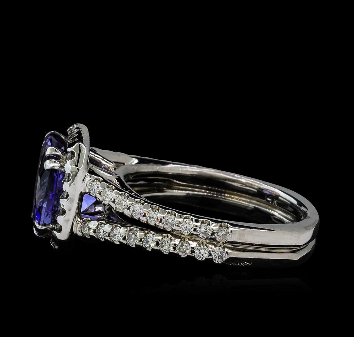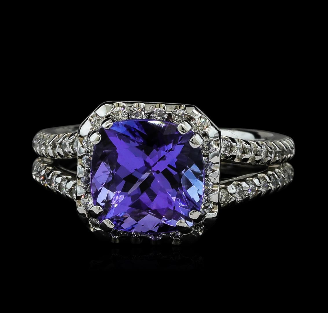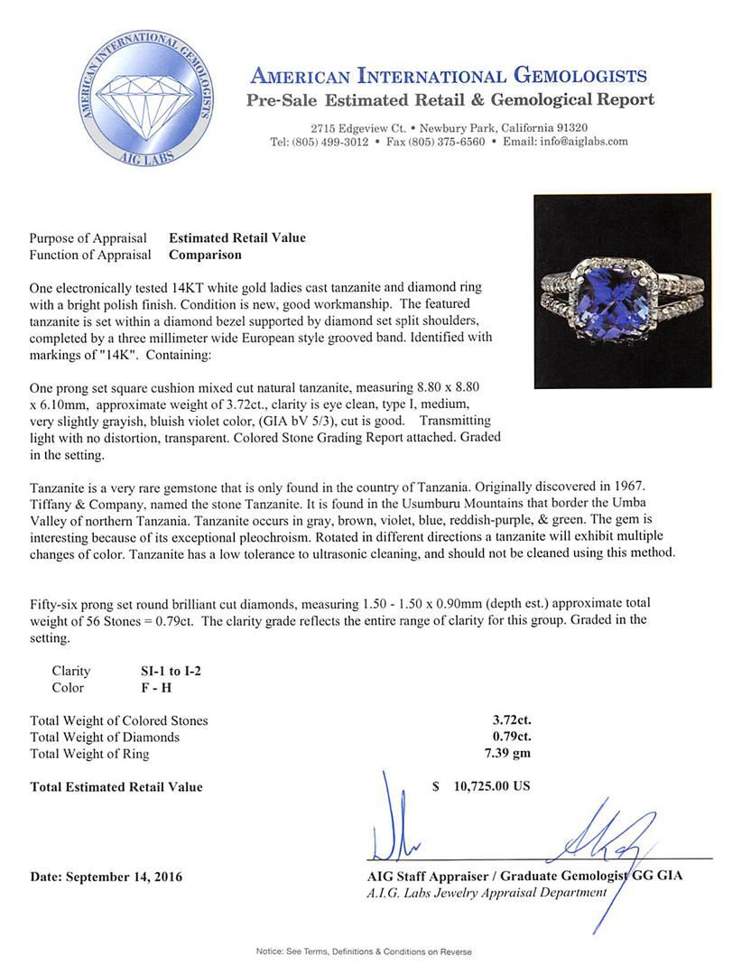 One electronically tested 14KT white gold ladies cast tanzanite and diamond ring with a bright polish finish. The featured tanzanite is set within a diamond bezel supported by diamond set split shoulders, completed by a three millimeter wide European style grooved band. Identified with markings of '14K'. Condition is new, good workmanship. Containing: One prong set square cushion mixed cut natural tanzanite, measuring 8.80 x 8.80 x 6.10mm, approximate weight of 3.72ct., clarity is eye clean, type I, medium, very slightly grayish, bluish violet color, (GIA bV 5/3), cut is good. Transmitting light with no distortion, transparent. Colored Stone Grading Report attached. Graded in the setting. Tanzanite is a very rare gemstone that is only found in the country of Tanzania. Originally discovered in 1967. Tiffany & Company, named the stone Tanzanite. It is found in the Usumburu Mountains that border the Umba Valley of northern Tanzania. Tanzanite occurs in gray, brown, violet, blue, reddish-purple, & green. The gem is interesting because of its exceptional pleochroism. Rotated in different directions a tanzanite will exhibit multiple changes of color. Tanzanite has a low tolerance to ultrasonic cleaning, and should not be cleaned using this method. Fifty-Six prong set round brilliant cut diamonds, measuring 1.50 - 1.50 x 0.90mm (depth est.) approximate total weight of 56 Stones = 0.79ct. The clarity grade reflects the entire range of clarity for this group. Graded in the setting. Clarity SI-1 to I-2. Color: F - H. Total Weight of Colored Stones 3.72ct.. Total Weight of Diamonds 0.79ct.. Total Weight of Ring 7.39gm. AIG Appraised at $10,725.00.