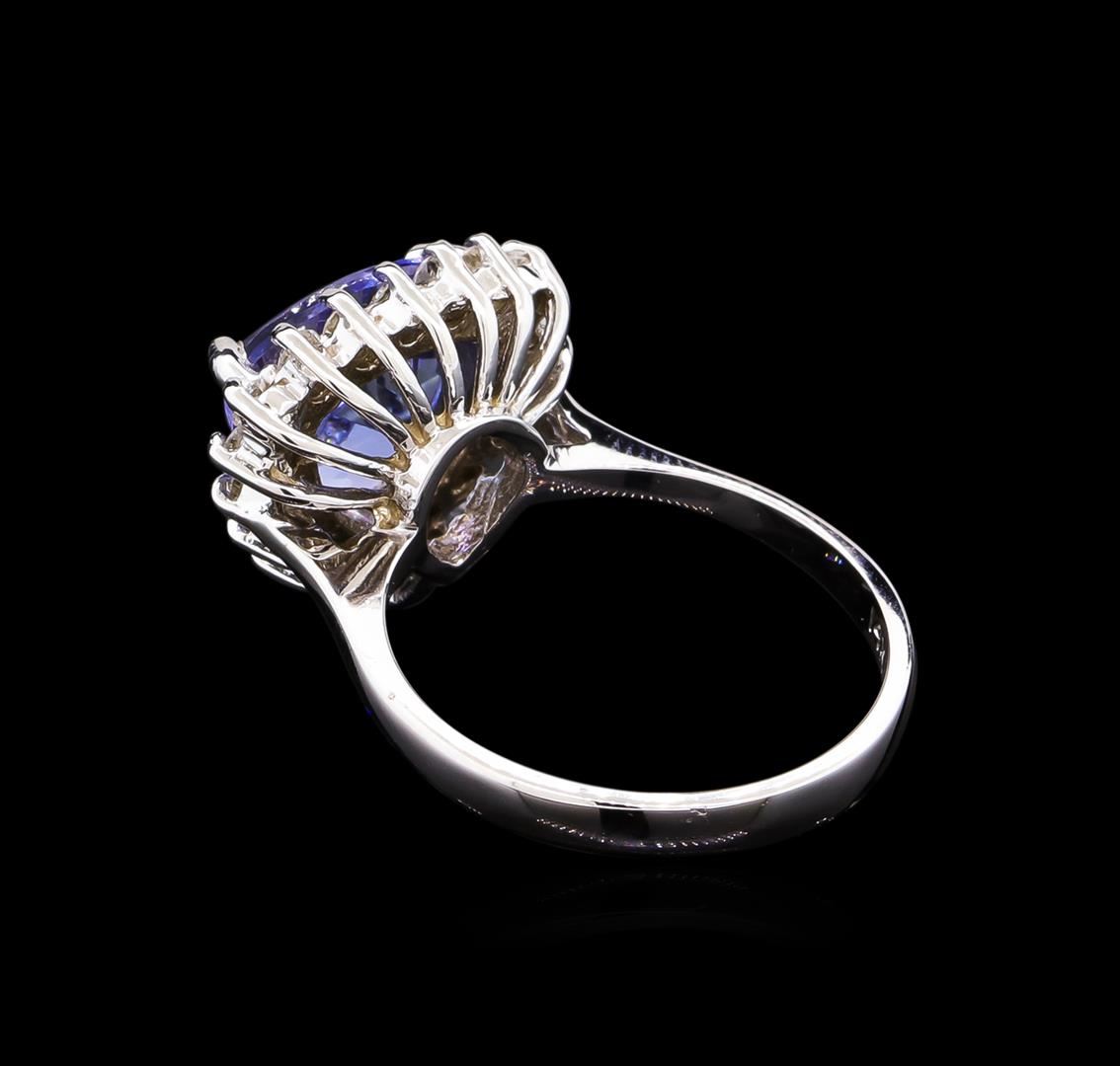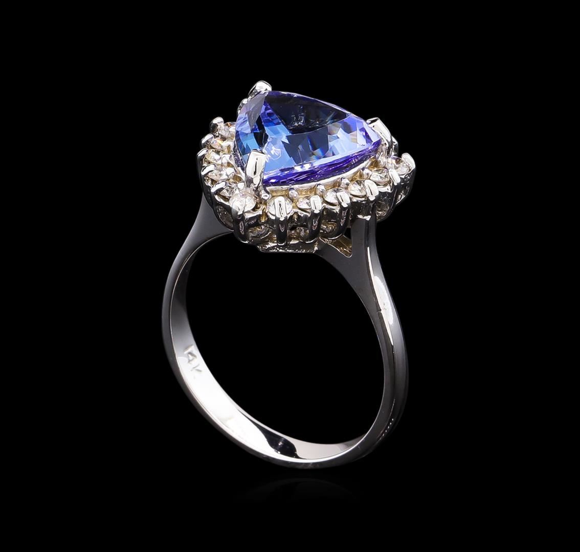 One electronically tested 14KT white gold lady's cast fashion ring with a basket halo with a bright polish finish. The featured lady's ring has a shank measuring 2.65 millimeters wide. Identified with markings of "14K". Condition is new, good workmanship. Containing: One prong set triangle modified brilliant cut natural tanzanite, measuring 10.20 x 10.00 x 6.10mm, approximate weight of 3.72ct., clarity is eye clean, type I, medium, very slightly grayish, bluish violet color, (GIA bV 5/3), cut is good. Transmitting light with no distortion, transparent. Colored gemstones are presumed to have been subjected to commonly used enhancement processes. Graded in the setting. Eighteen prong set round brilliant cut diamonds, measuring 1.90 - 1.80 x 1.15mm (depth est.) approximate total weight of 18 Stones = 0.43ct. Graded in the setting. Clarity: SI-1 to SI-2. Color: H - I. Cut Very Good. Total Weight of Colored Stones 3.72ct. Total Weight of Diamonds 0.43ct. Total Weight of Ring 5.40gm. GAS Appraised at $6,805.00.