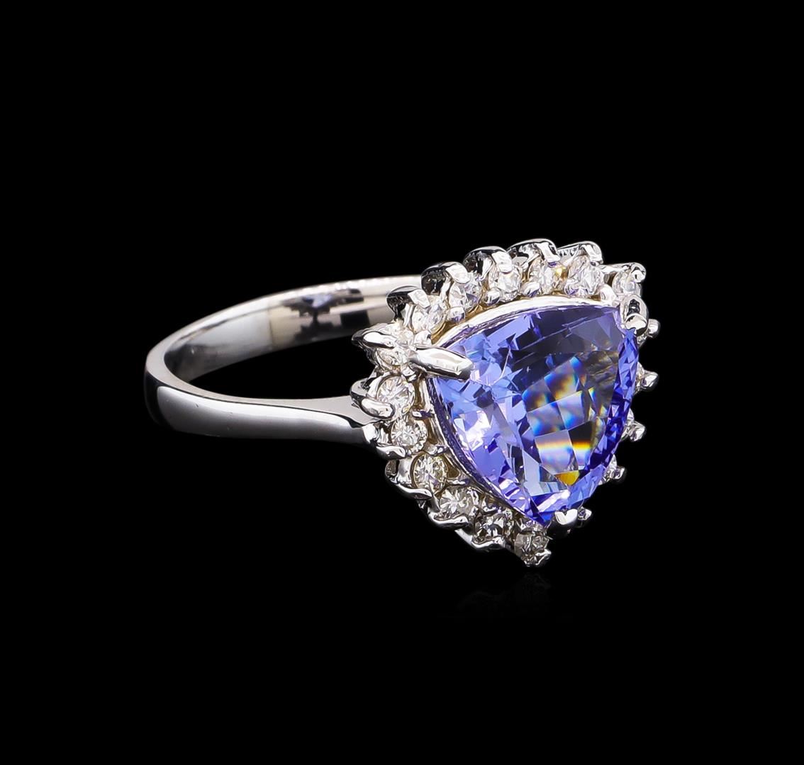 One electronically tested 14KT white gold lady's cast fashion ring with a basket halo with a bright polish finish. The featured lady's ring has a shank measuring 2.65 millimeters wide. Identified with markings of "14K". Condition is new, good workmanship. Containing: One prong set triangle modified brilliant cut natural tanzanite, measuring 10.20 x 10.00 x 6.10mm, approximate weight of 3.72ct., clarity is eye clean, type I, medium, very slightly grayish, bluish violet color, (GIA bV 5/3), cut is good. Transmitting light with no distortion, transparent. Colored gemstones are presumed to have been subjected to commonly used enhancement processes. Graded in the setting. Eighteen prong set round brilliant cut diamonds, measuring 1.90 - 1.80 x 1.15mm (depth est.) approximate total weight of 18 Stones = 0.43ct. Graded in the setting. Clarity: SI-1 to SI-2. Color: H - I. Cut Very Good. Total Weight of Colored Stones 3.72ct. Total Weight of Diamonds 0.43ct. Total Weight of Ring 5.40gm. GAS Appraised at $6,805.00.