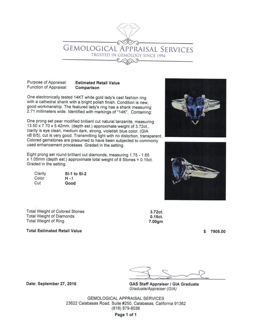 One electronically tested 14KT white gold lady's cast fashion ring with a cathedral shank with a bright polish finish. The featured lady's ring has a shank measuring 2.71 millimeters wide. Identified with markings of '14K'. Condition is new, good workmanship. Containing: One prong set pear modified brilliant cut natural tanzanite, measuring 13.50 x 7.70 x 5.42mm, (depth est.) approximate weight of 3.72ct., clarity is eye clean, medium dark, strong, violetish blue color, (GIA vB 6/5), cut is very good. Transmitting light with no distortion, transparent. Colored gemstones are presumed to have been subjected to commonly used enhancement processes. Graded in the setting. Eight prong set round brilliant cut diamonds, measuring 1.75 - 1.65 x 1.05mm (depth est.) approximate total weight of 8 Stones = 0.15ct. Graded in the setting. Clarity SI-1 to SI-2. Color: H - I Cut Good. Total Weight of Colored Stones 3.72ct.. Total Weight of Diamonds 0.15ct.. Total Weight of Ring 7.00gm. GAS Appraised at $7,905.00.