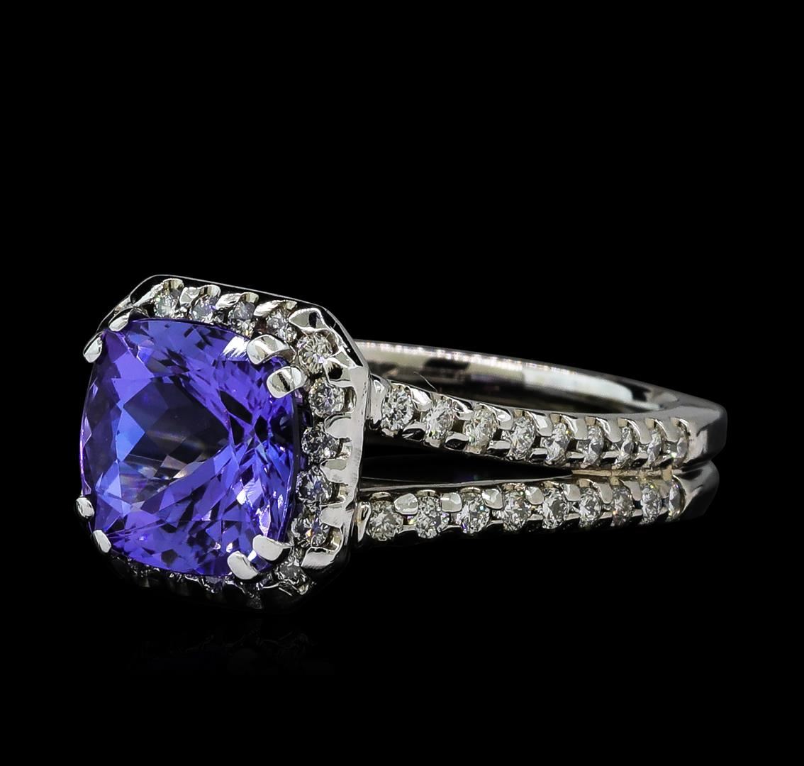 One electronically tested 14KT white gold ladies cast tanzanite and diamond ring with a bright polish finish. The featured tanzanite is set within a diamond bezel supported by diamond set split shoulders, completed by a three millimeter wide European style grooved band. Identified with markings of '14K'. Condition is new, good workmanship. Containing: One prong set square cushion mixed cut natural tanzanite, measuring 8.80 x 8.80 x 6.10mm, approximate weight of 3.72ct., clarity is eye clean, type I, medium, very slightly grayish, bluish violet color, (GIA bV 5/3), cut is good. Transmitting light with no distortion, transparent. Colored Stone Grading Report attached. Graded in the setting. Tanzanite is a very rare gemstone that is only found in the country of Tanzania. Originally discovered in 1967. Tiffany & Company, named the stone Tanzanite. It is found in the Usumburu Mountains that border the Umba Valley of northern Tanzania. Tanzanite occurs in gray, brown, violet, blue, reddish-purple, & green. The gem is interesting because of its exceptional pleochroism. Rotated in different directions a tanzanite will exhibit multiple changes of color. Tanzanite has a low tolerance to ultrasonic cleaning, and should not be cleaned using this method. Fifty-Six prong set round brilliant cut diamonds, measuring 1.50 - 1.50 x 0.90mm (depth est.) approximate total weight of 56 Stones = 0.79ct. The clarity grade reflects the entire range of clarity for this group. Graded in the setting. Clarity SI-1 to I-2. Color: F - H. Total Weight of Colored Stones 3.72ct.. Total Weight of Diamonds 0.79ct.. Total Weight of Ring 7.39gm. AIG Appraised at $10,725.00.