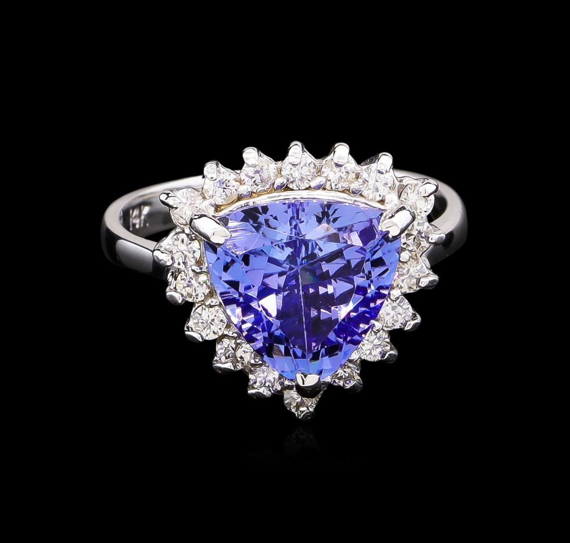 One electronically tested 14KT white gold lady's cast fashion ring with a basket halo with a bright polish finish. The featured lady's ring has a shank measuring 2.65 millimeters wide. Identified with markings of "14K". Condition is new, good workmanship. Containing: One prong set triangle modified brilliant cut natural tanzanite, measuring 10.20 x 10.00 x 6.10mm, approximate weight of 3.72ct., clarity is eye clean, type I, medium, very slightly grayish, bluish violet color, (GIA bV 5/3), cut is good. Transmitting light with no distortion, transparent. Colored gemstones are presumed to have been subjected to commonly used enhancement processes. Graded in the setting. Eighteen prong set round brilliant cut diamonds, measuring 1.90 - 1.80 x 1.15mm (depth est.) approximate total weight of 18 Stones = 0.43ct. Graded in the setting. Clarity: SI-1 to SI-2. Color: H - I. Cut Very Good. Total Weight of Colored Stones 3.72ct. Total Weight of Diamonds 0.43ct. Total Weight of Ring 5.40gm. GAS Appraised at $6,805.00.