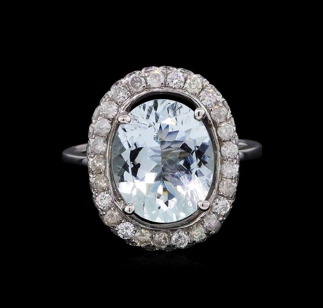 One electronically tested 14KT white gold lady's cast fashion ring with a double halo with a bright polish finish. The featured lady's ring has a shank measuring 1.64 millimeters wide. Trademark is Orianne. Identified with markings of '14K'. Condition is new, good workmanship. Containing: One prong set oval modified brilliant cut natural aquamarine, measuring 12.05 x 9.98 x 5.68mm, approximate weight of 3.73ct., clarity is slightly included, type I, light, very slightly grayish, very slightly greenish blue color, (GIA vslgB 3/3), cut is good. Transmitting light with no distortion, transparent. Colored gemstones are presumed to have been subjected to commonly used enhancement processes. Graded in the setting. Fifty-Four prong set round brilliant cut diamonds, measuring 1.90 - 1.80 x 1.11mm (depth est.) approximate total weight of 54 Stones = 1.21ct. Graded in the setting. Clarity SI-2 to I-2. Color: H - J Cut Good. Total Weight of Colored Stones 3.73ct.. Total Weight of Diamonds 1.21ct.. Total Weight of Ring 5.10gm. GAS Appraised at $6,595.00.