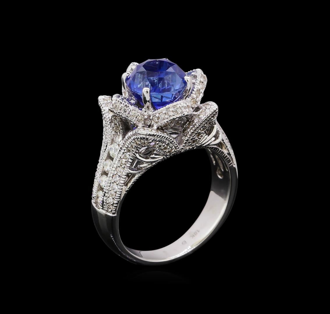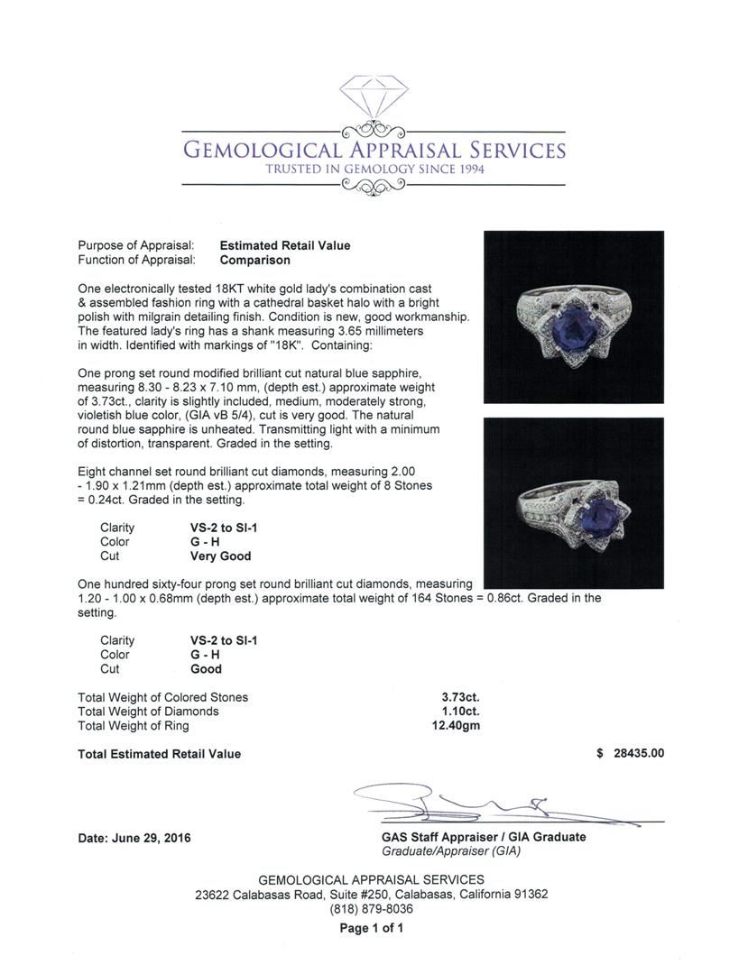 One electronically tested 18KT white gold lady's combination cast & assembled fashion ring with a cathedral basket halo with a bright polish with milgrain detailing finish. The featured lady's ring has a shank measuring 3.65 millimeters in width. Identified with markings of "18K". Condition is new, good workmanship. Containing: One prong set round modified brilliant cut natural blue sapphire, measuring 8.30 - 8.23 x 7.10 mm, (depth est.) approximate weight of 3.73ct., clarity is slightly included, medium, moderately strong, violetish blue color, (GIA vB 5/4), cut is very good. The natural round blue sapphire is unheated. Transmitting light with a minimum of distortion, transparent. Graded in the setting. Eight channel set round brilliant cut diamonds, measuring 2.00 - 1.90 x 1.21mm (depth est.) approximate total weight of 8 Stones = 0.24ct. Graded in the setting. Clarity: VS-2 to SI-1. Color: G - Very Good One Hundred Sixty-Four prong set round brilliant cut diamonds, measuring 1.20 - 1.00 x 0.68mm (depth est.) approximate total weight of 164 Stones = 0.86ct. Graded in the setting. Clarity: VS-2 to SI-1. Color: G - Good. Total Weight of Colored Stones 3.73ct. Total Weight of Diamonds 1.10ct. Total Weight of Ring 12.40gm. GAS Appraised at $28,435.00.