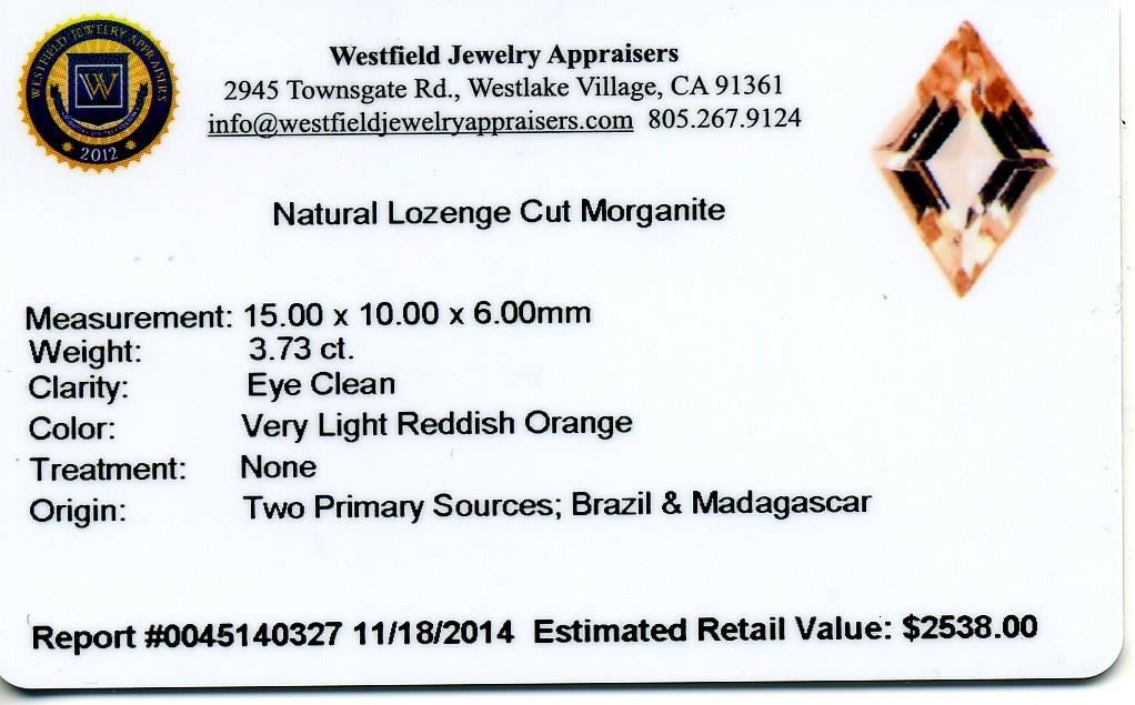 3.73ctw. Natural Lozenge Cut Morganite. Westfield Appraised at $2,538.00.